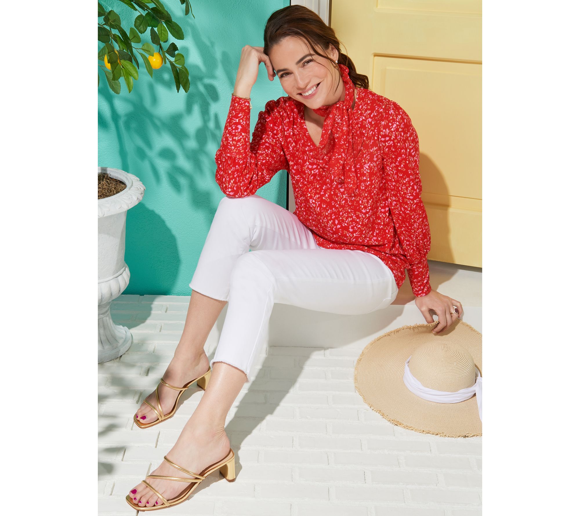 Talk about chic -- this V-neck top dazzles with its cuffed sleeves and gorgeous print. The neck tie gives it that distinct style that simply cannot be ignored. From Isaac Mizrahi Live!TM.