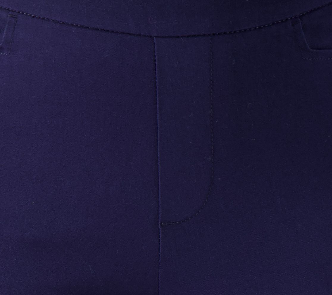 Features: pull-on style, crop length, encased elastic at waistband, front J-stitch fly, functional L-pocket, side slit