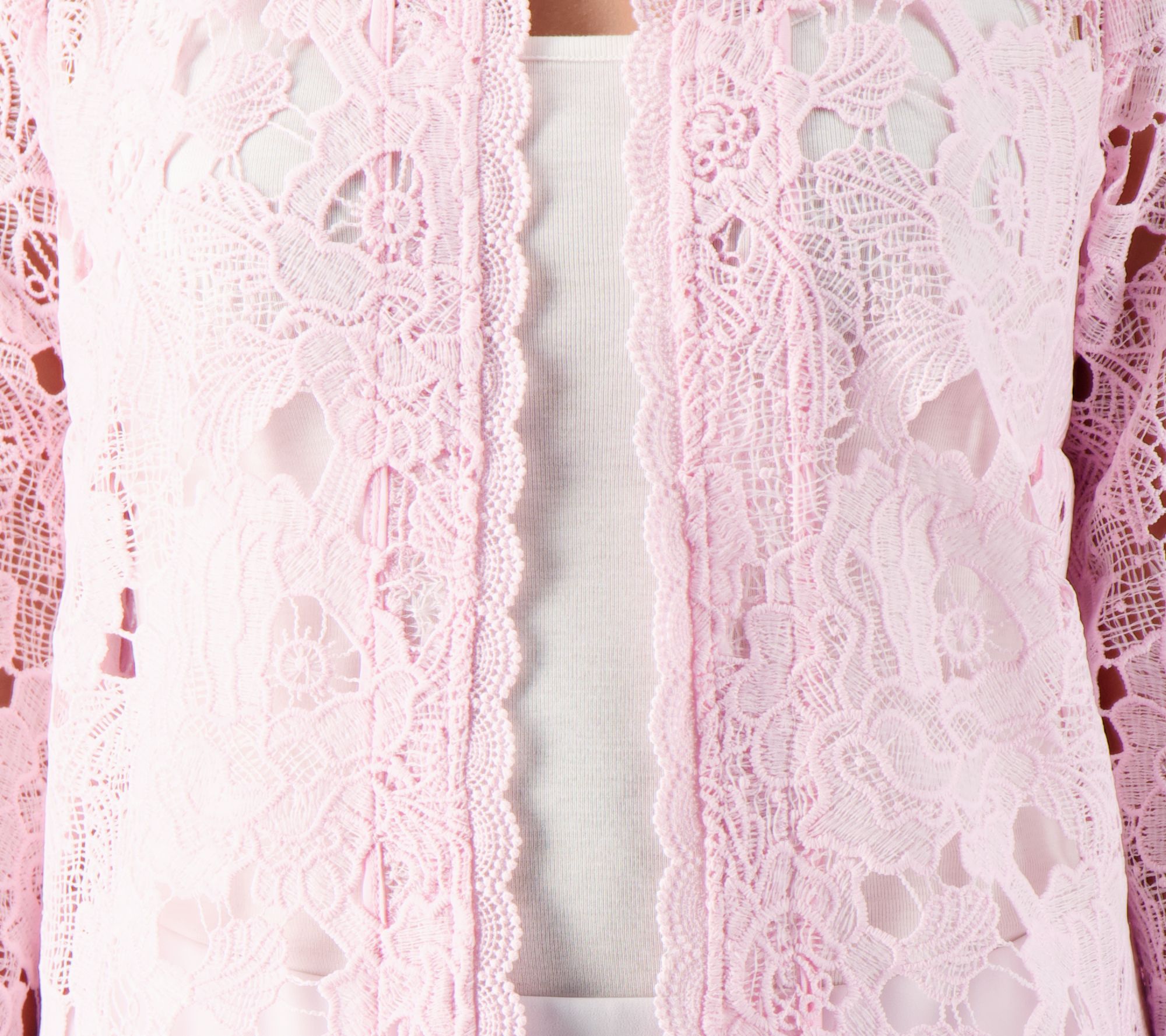 • Features: scallop edge, unlined, open front placket with lace trim, 3/4-length bell sleeves