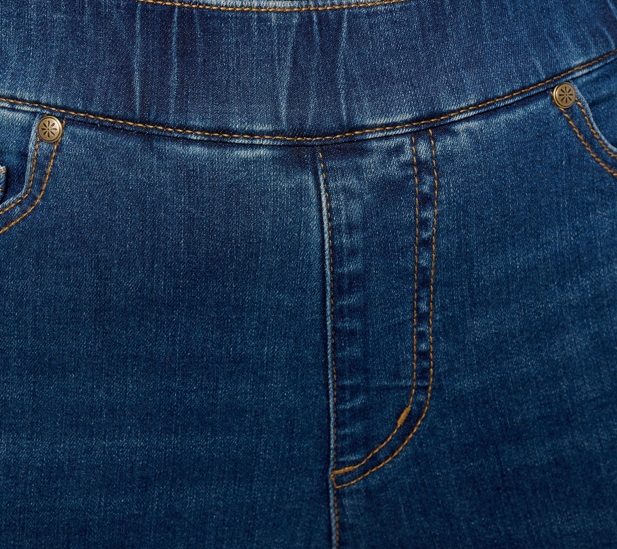Features: pull-on style, encased elastic waistband, five-pocket styling, built-in apron with cross-stitching for stomach smoothing, faux fly, deep hem