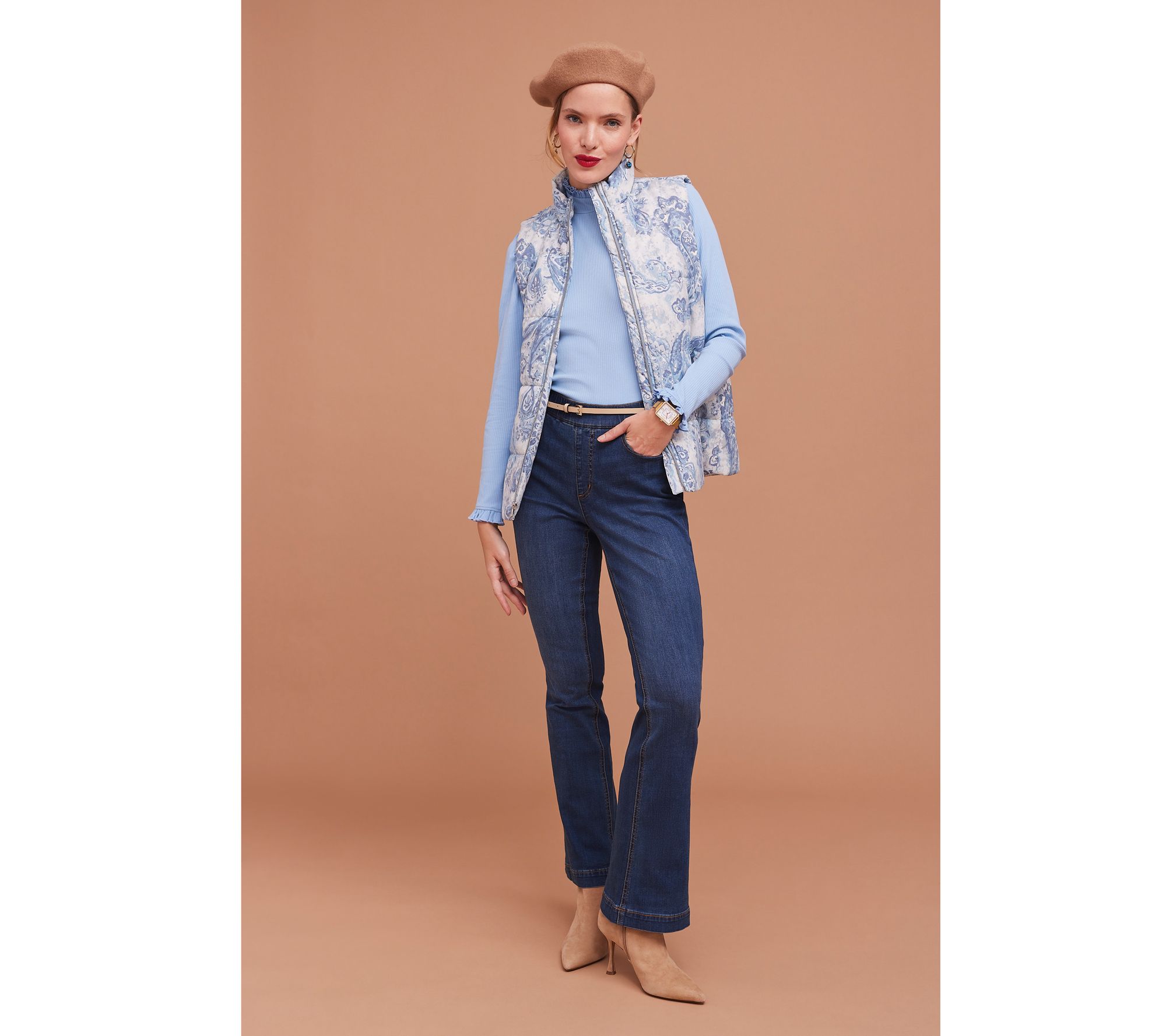 No wriggling. No shimmy-ing. No hoping the zipper won't split. These premium True Denim flared-leg jeans pull right on, so you can power through your day in sublime comfort looking poised and polished. Welcome to your worry-free wardrobe. From Isaac Mizrahi Live!TM.