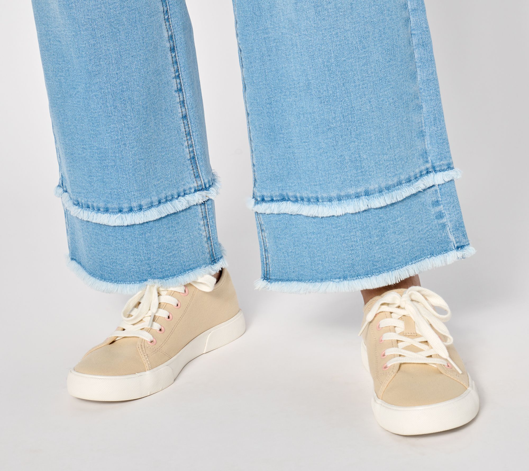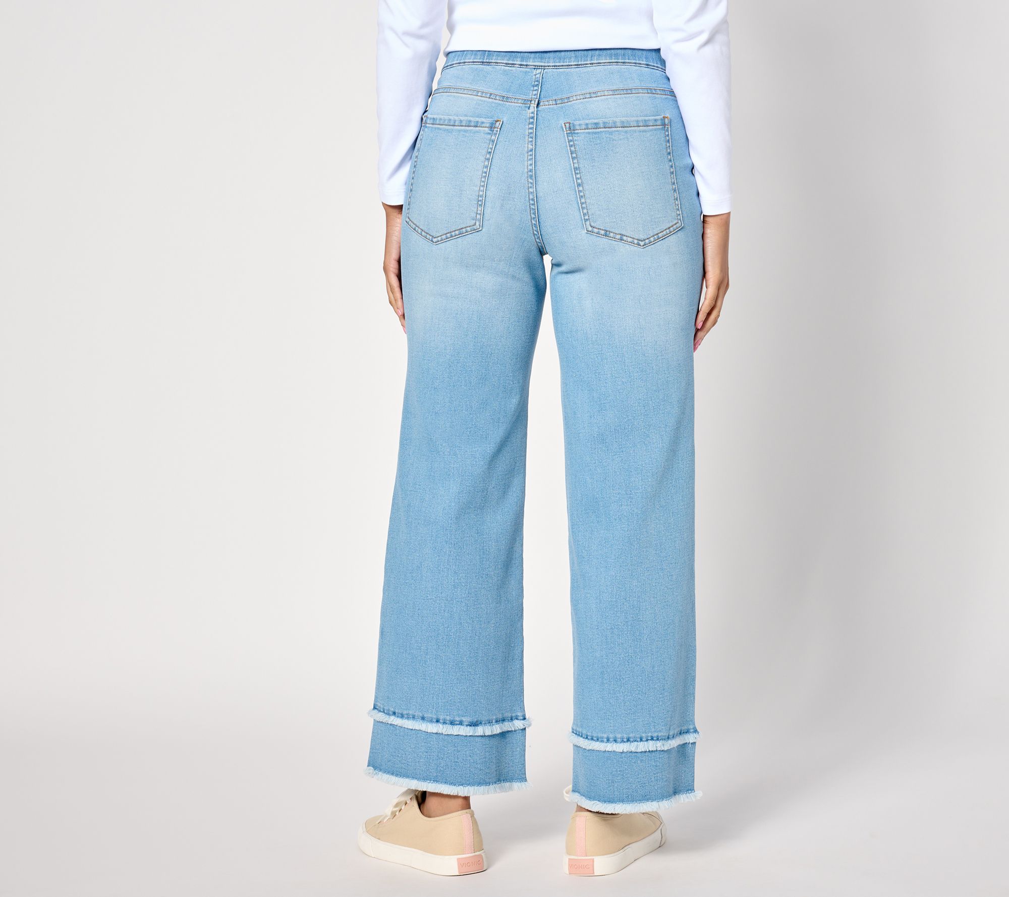 Your search for the perfect everyday denim stops here. Easy on/easy off, these pull-on jeans hug your curves with a fitted silhouette, then widen from the thigh to the leg opening for a relaxed, laid-back look and feel. Fringe at the hem is an added detail that looks cool no matter what footwear you pair with it. From Isaac Mizrahi Live!TM.