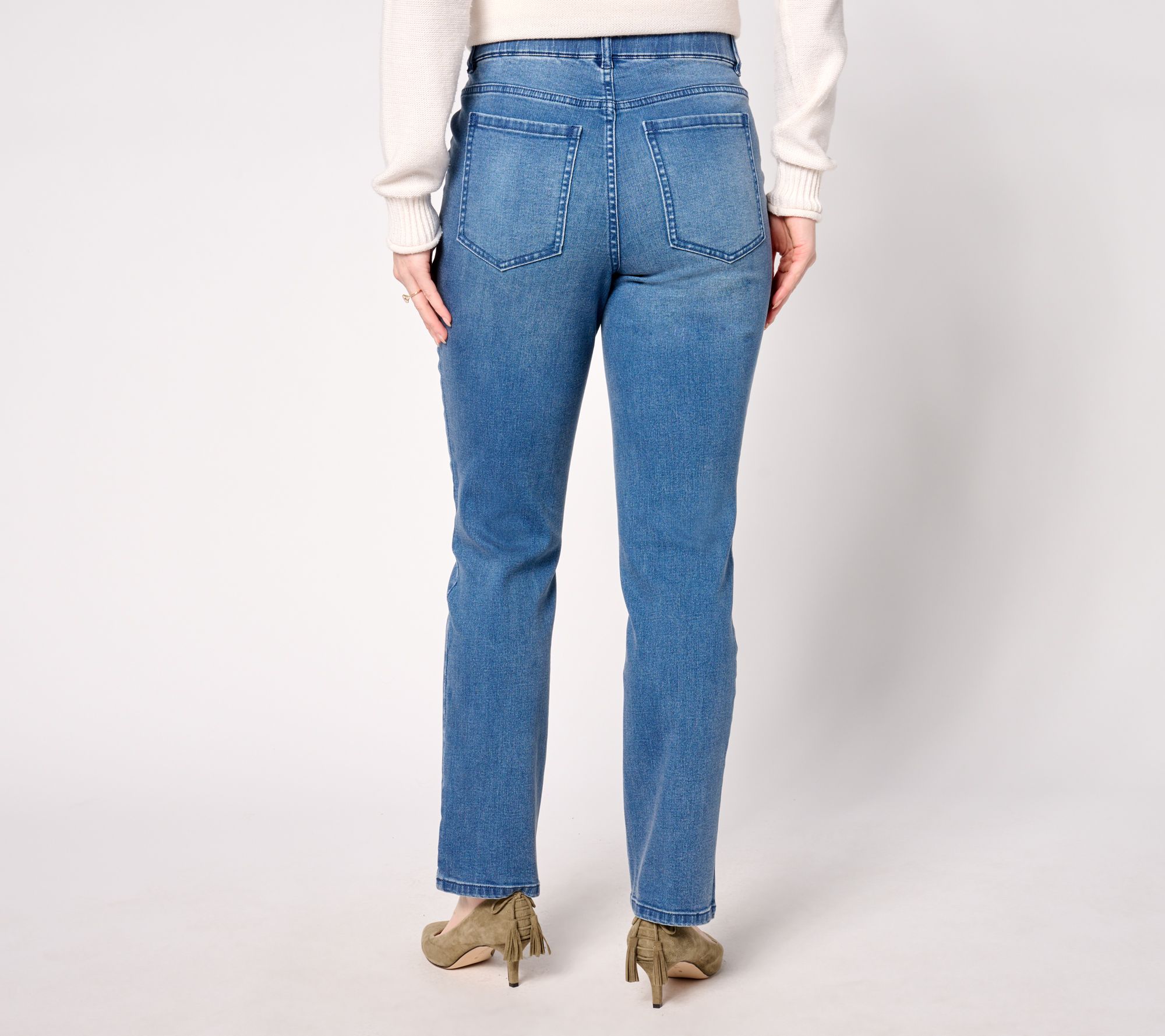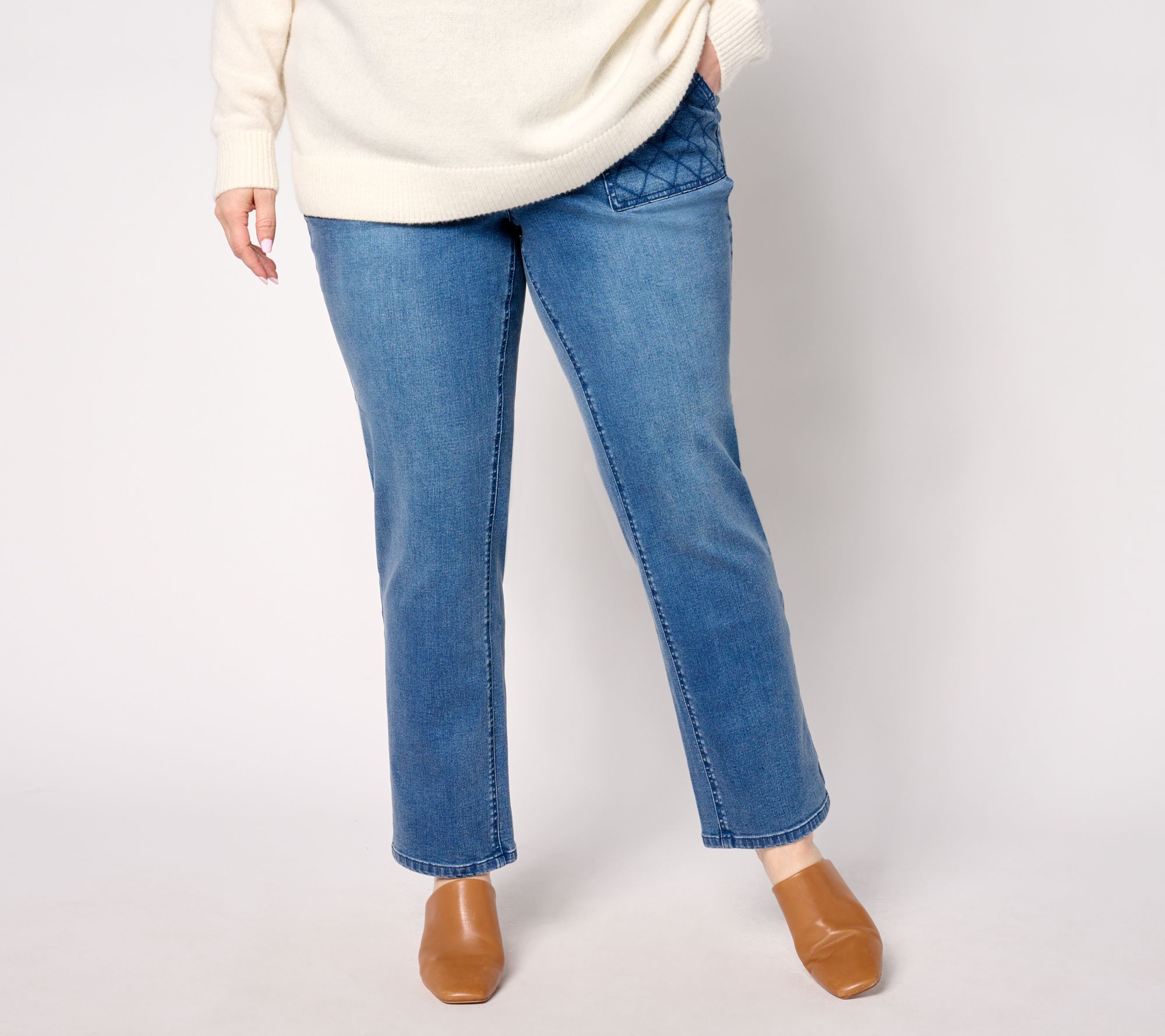 Quilted patch pockets add some personality points to the classic straight-leg silhouette of these easy-to-wear pull-on True Denim Indigo jeans. From Isaac Mizrahi Live!TM.