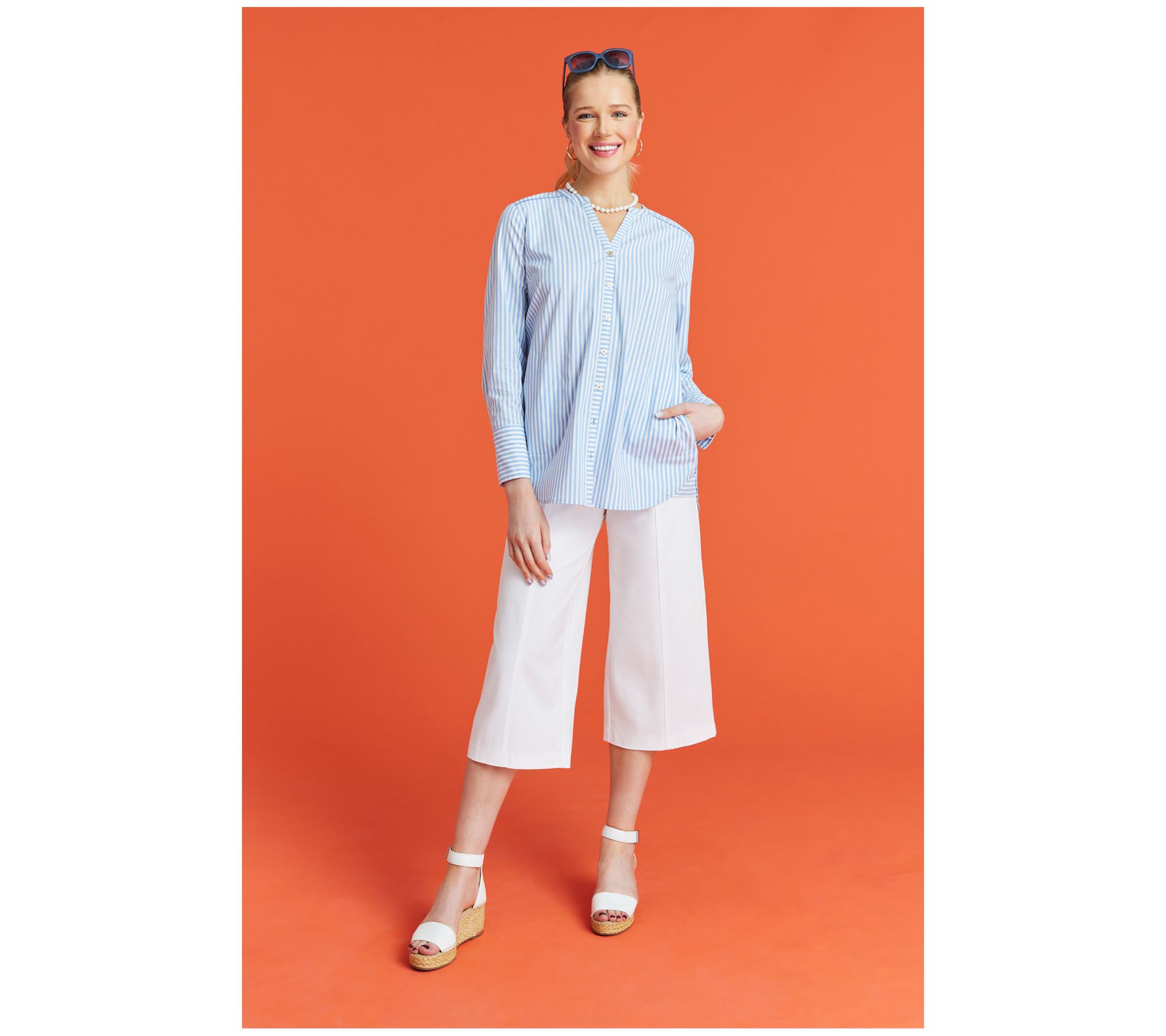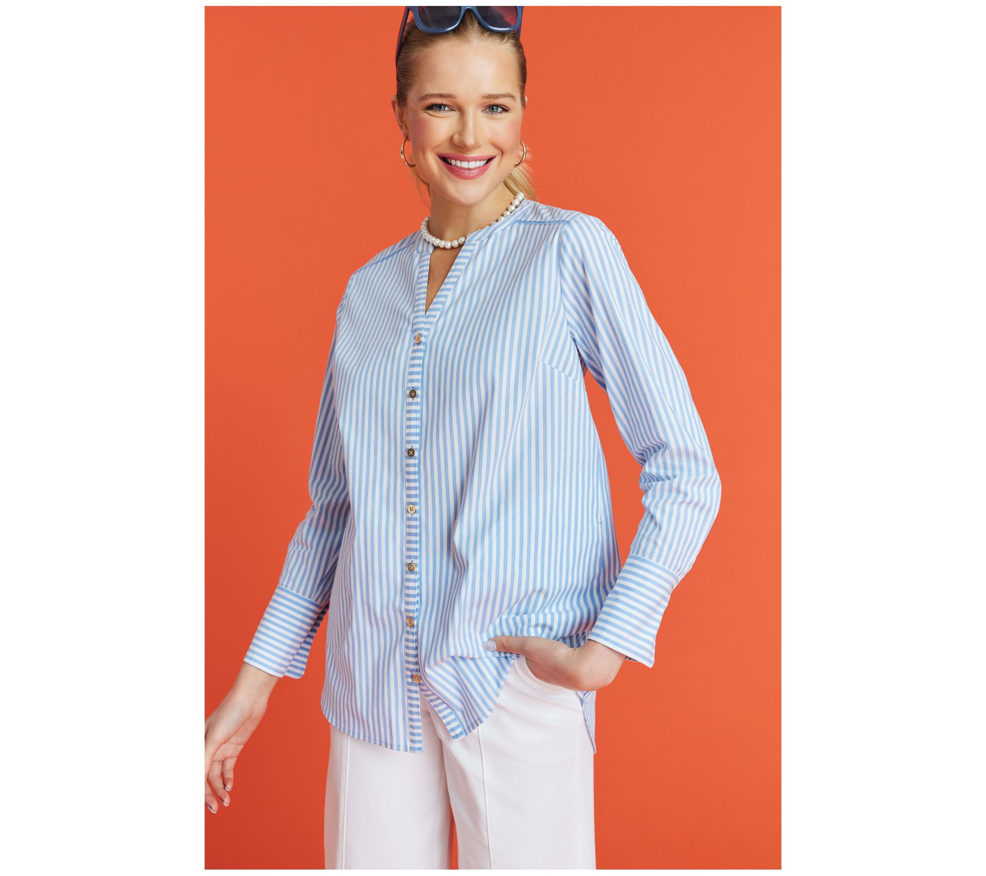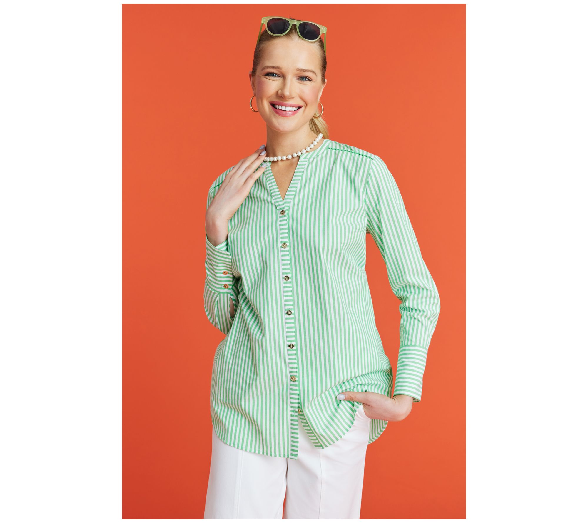 Sail through summer workdays -- and savor weekend getaways -- in this crisp striped tunic crafted in polished cotton. A bit of comfy stretch and elevated hardware make it the ideal companion for a meeting-packed afternoon or a sophisticated vineyard tour. From Isaac Mizrahi Live!TM.