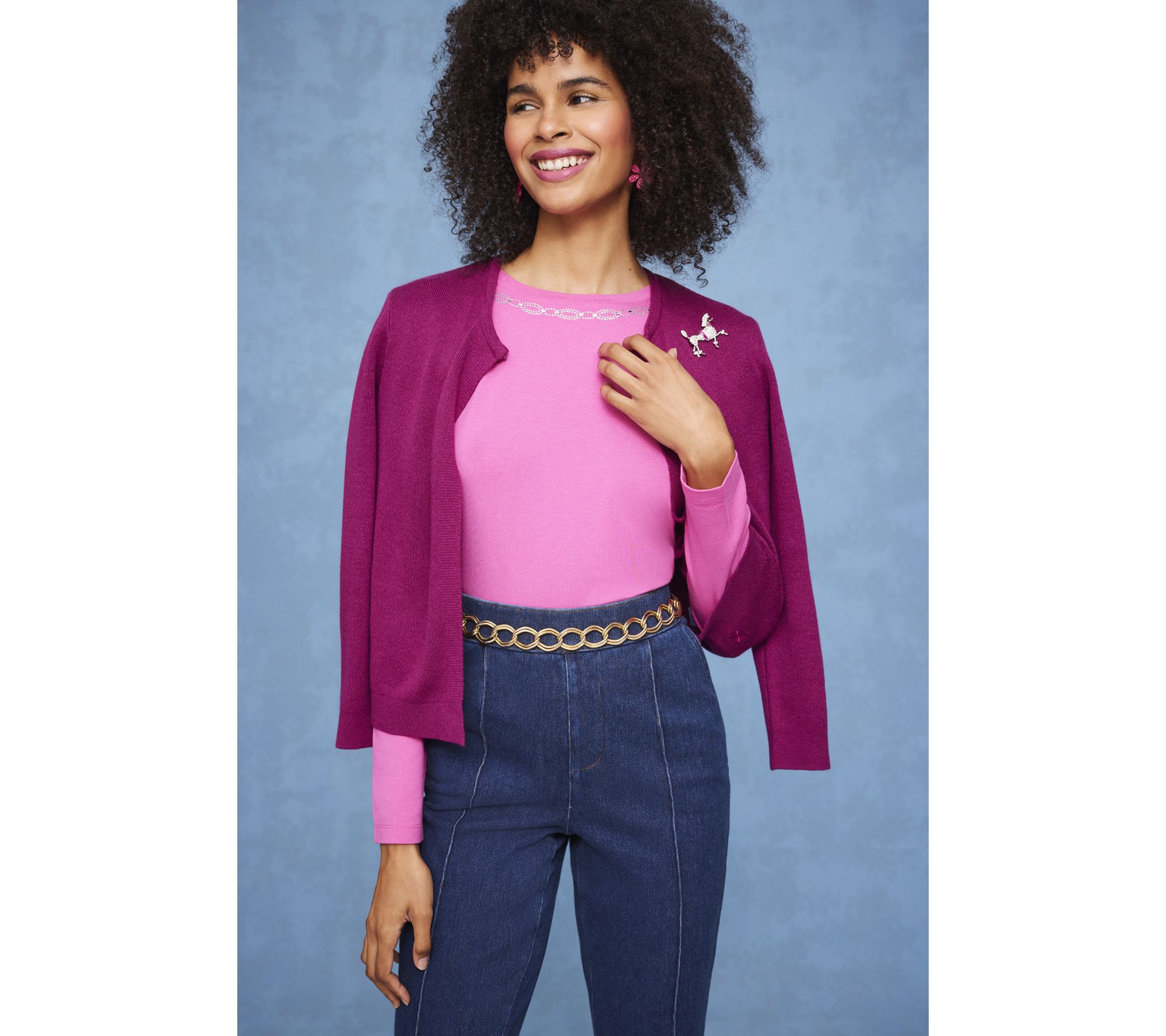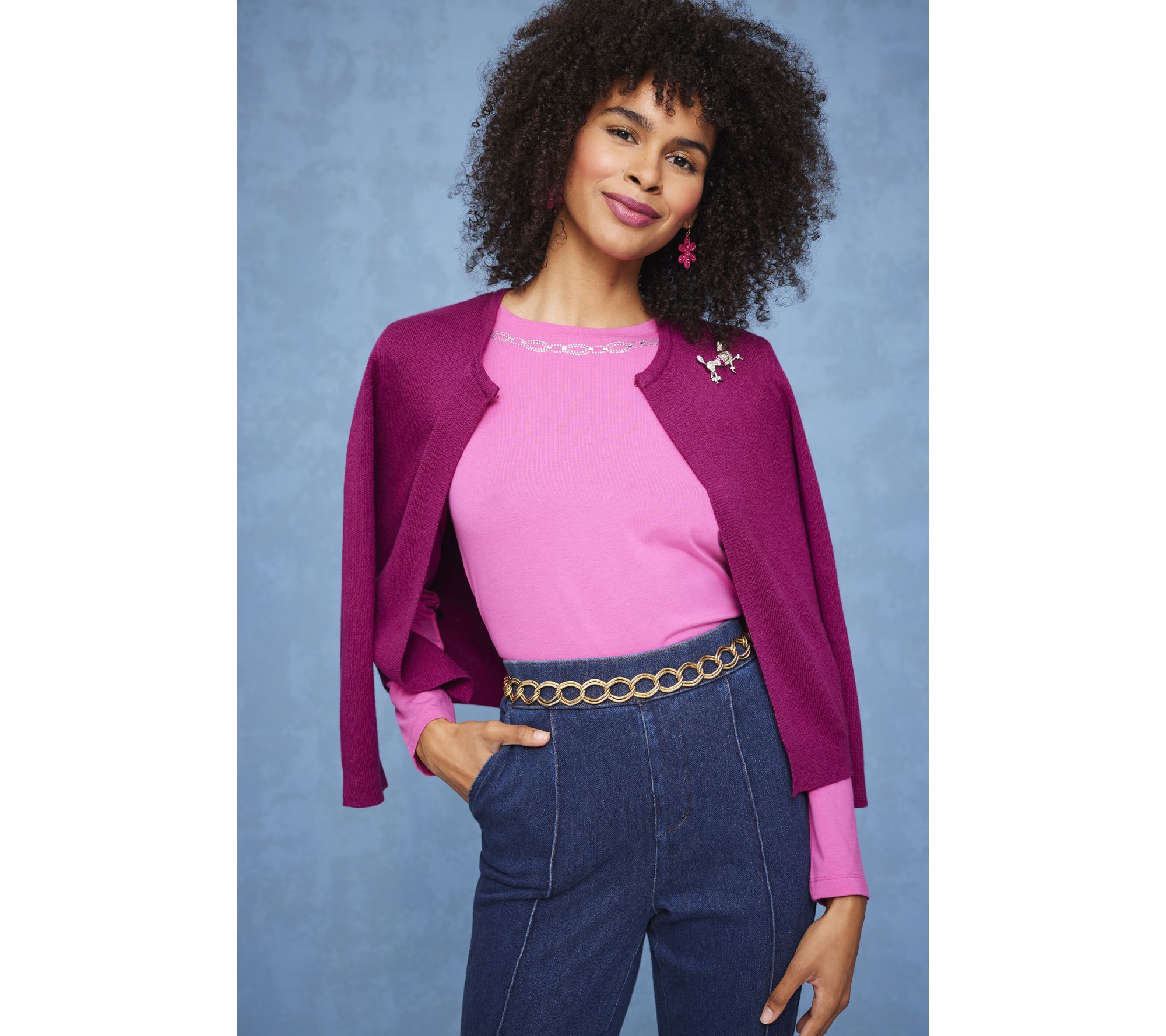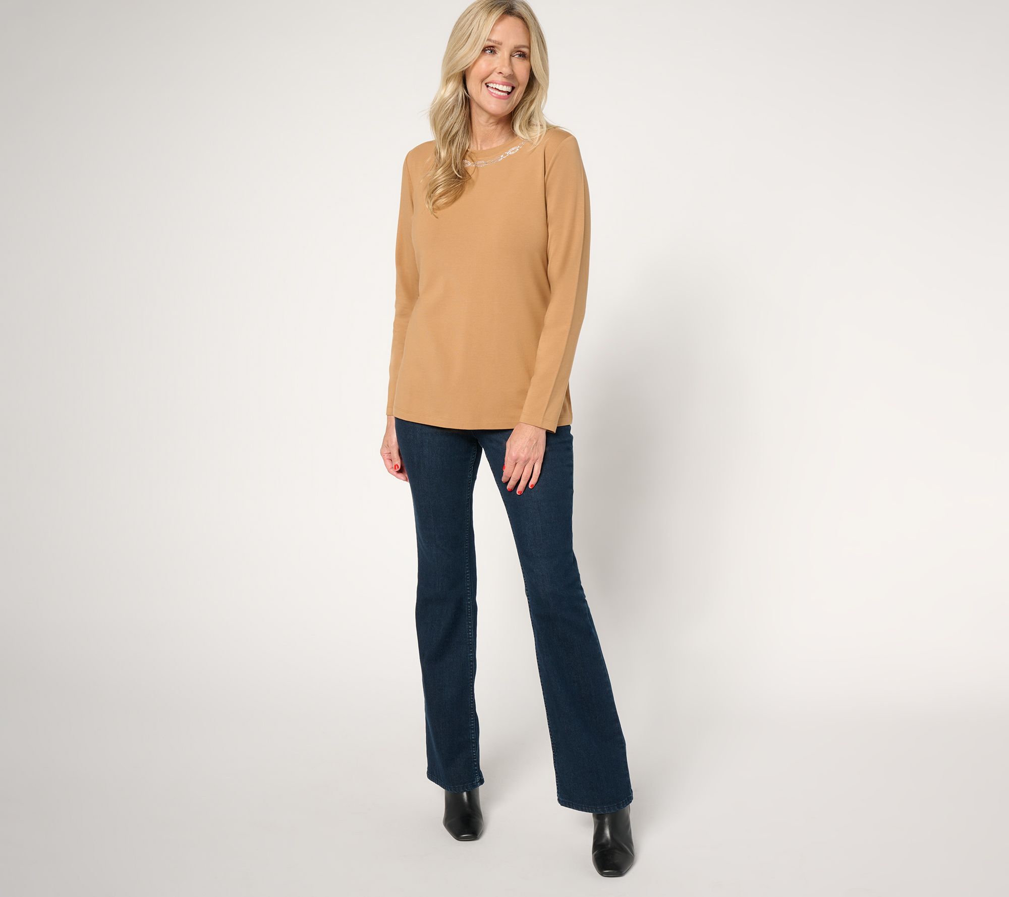 Leave the necklace at home. The rhinestone-embellished neckline on this long-sleeved top has all the bling you need. From Isaac Mizrahi Live!™.