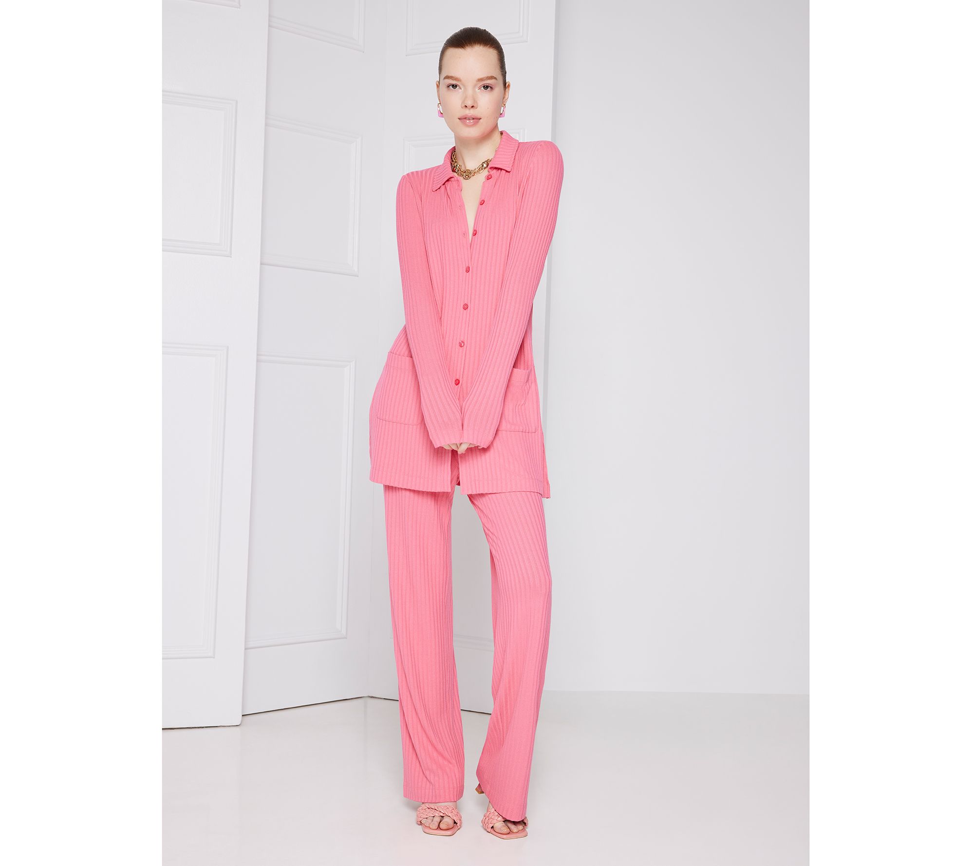 - Features: ribbed, placket with functional buttons, long sleeves, patch pockets with rounded bottom corners, side slits
