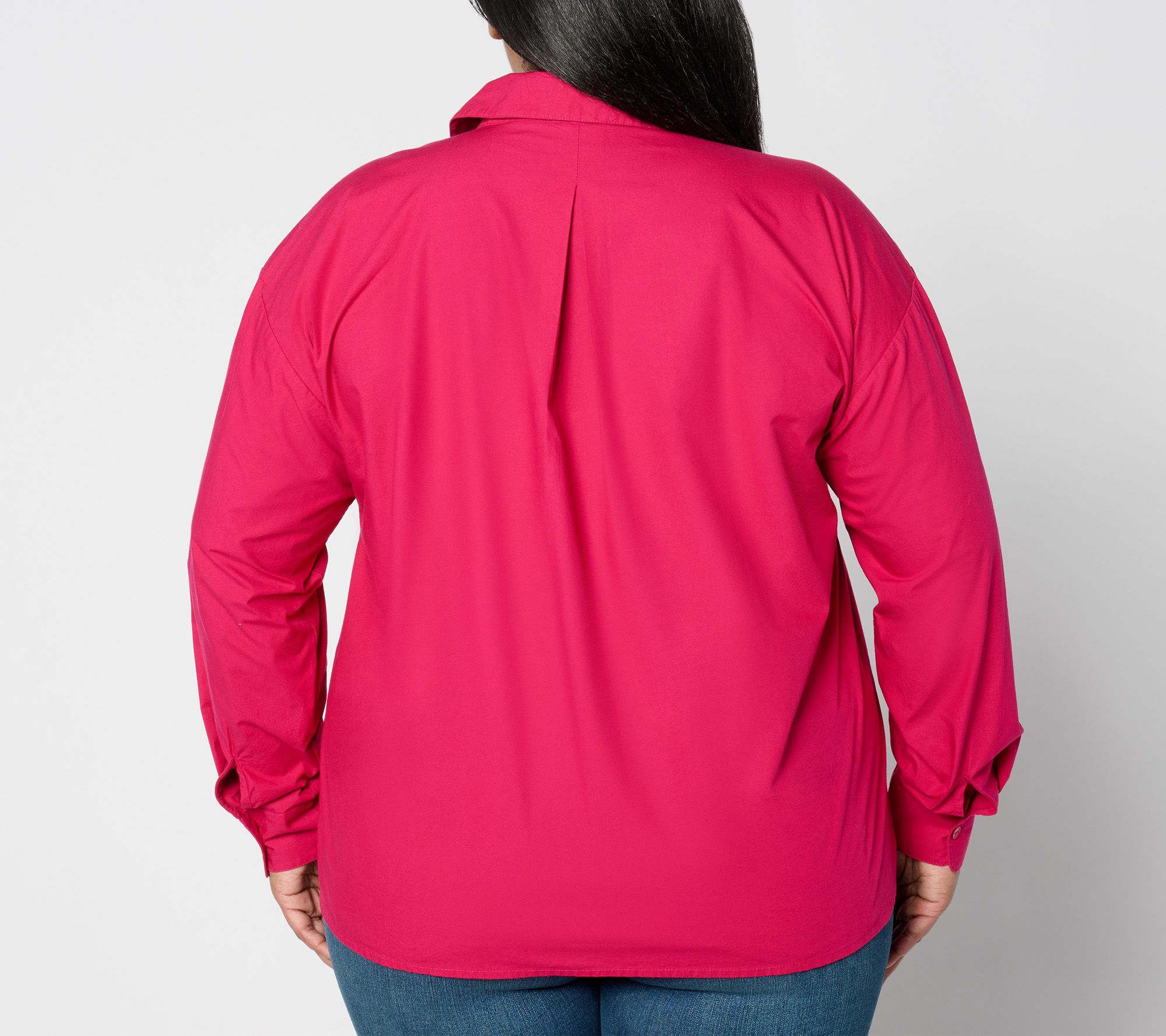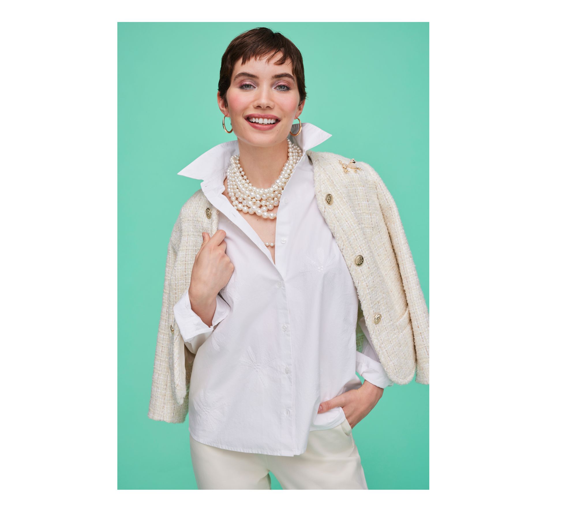 Accented with embroidery and sequin details, this poplin button-front shirt adds a bit of subtle spark to the traditional structured silhouette. From Isaac Mizrahi LiveTM.