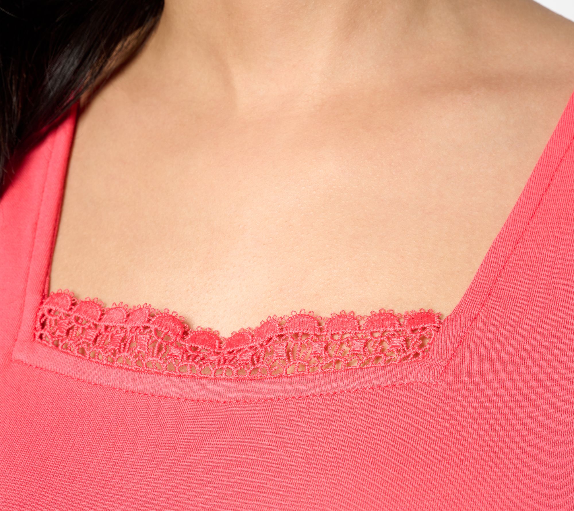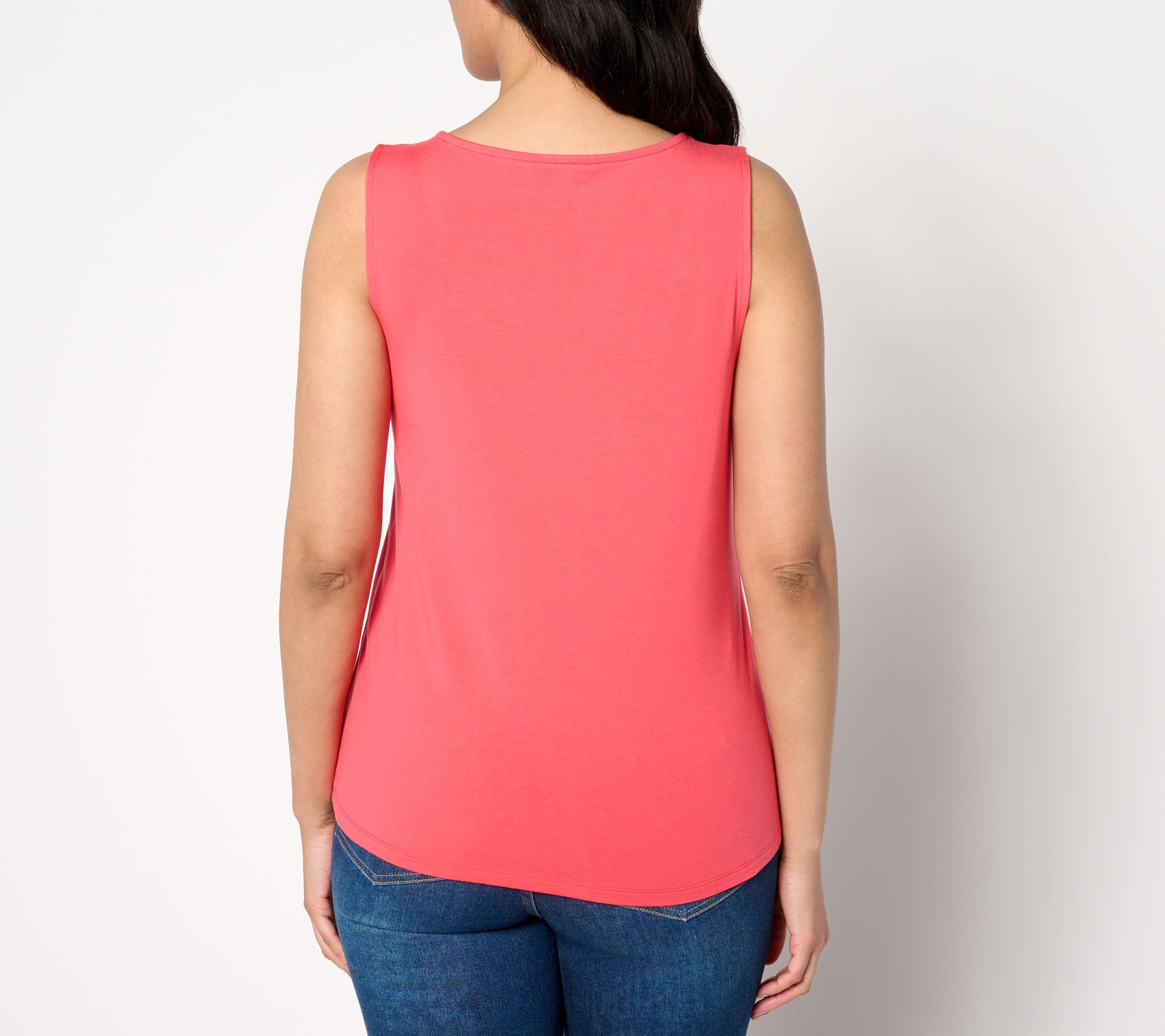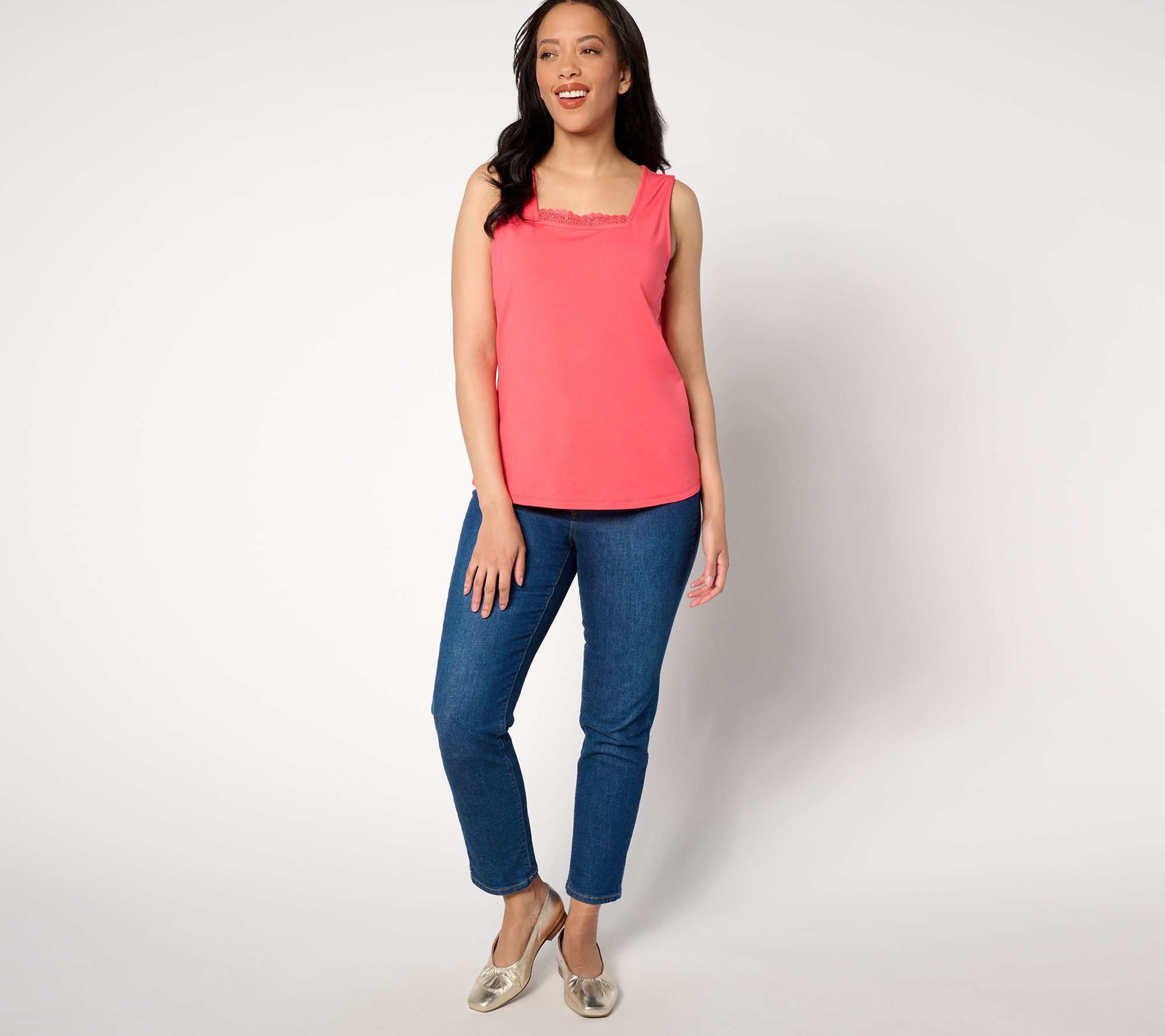 A true wardrobe essential, this sleeveless top goes with everything and makes an excellent layering piece. The crochet trim along the square neckline is an eye-catching accent that brings a level of sophistication to the look. From Isaac Mizrahi Live!TM.