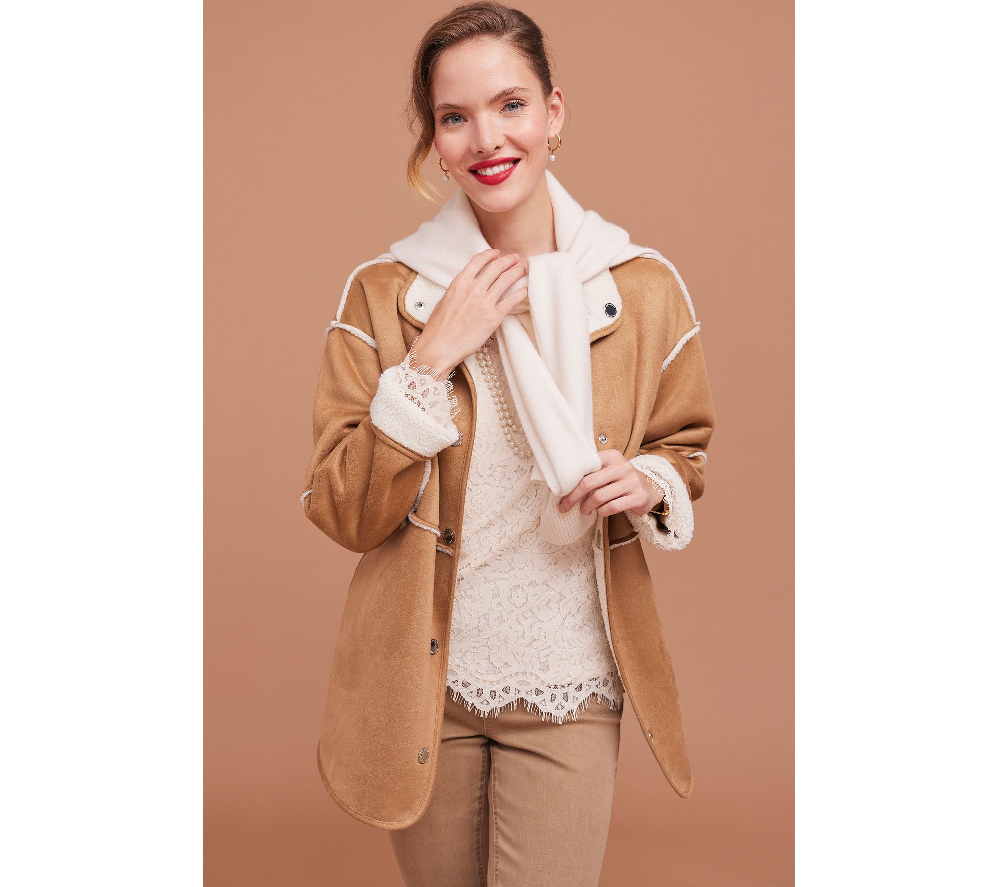 Features: scoop neckline, long sleeves, scallop eyelash hem, keyhole back with button closure, bust darts, lined body