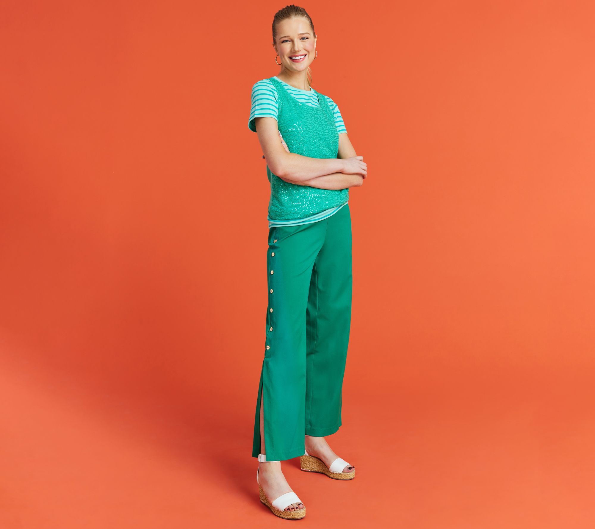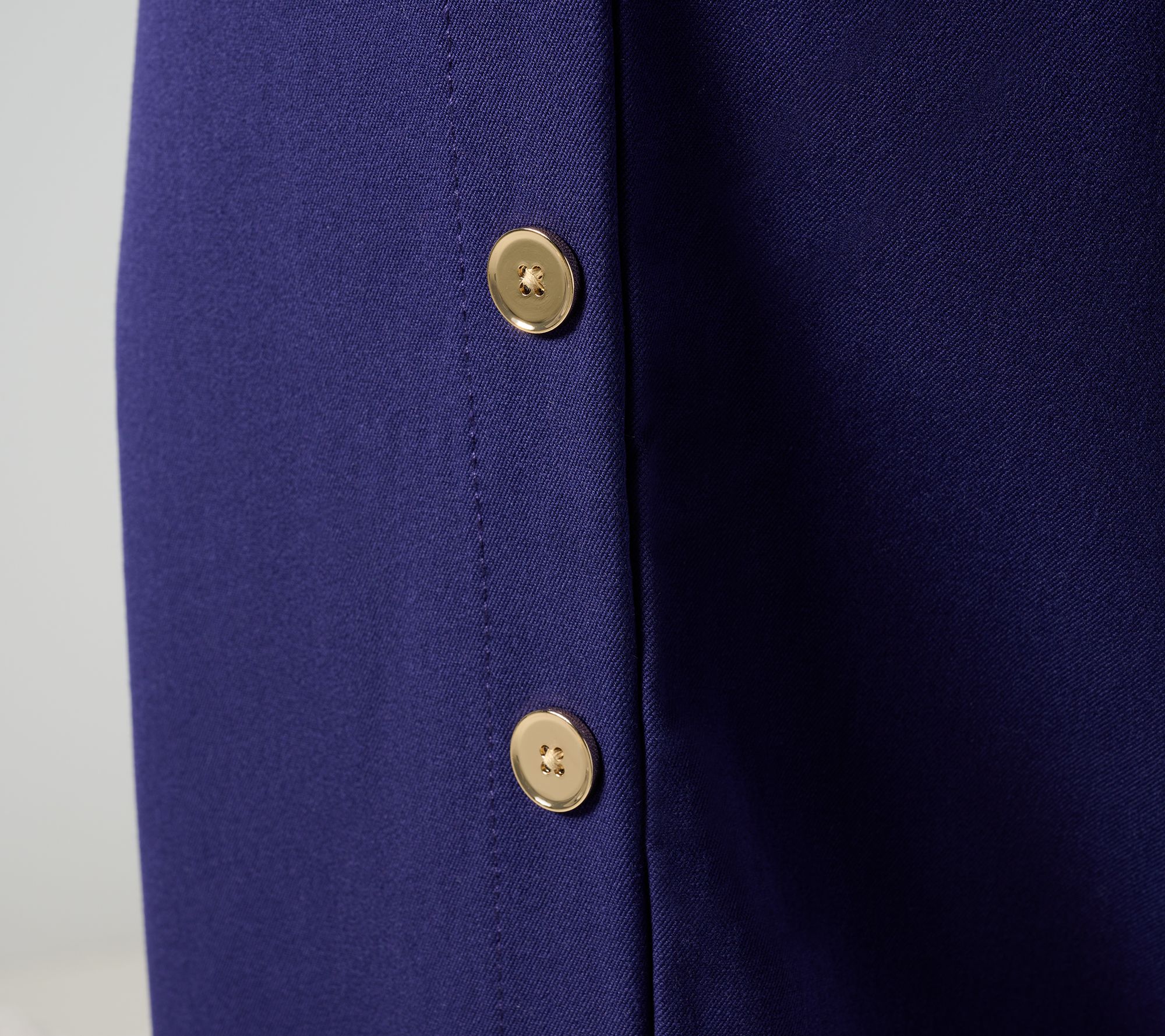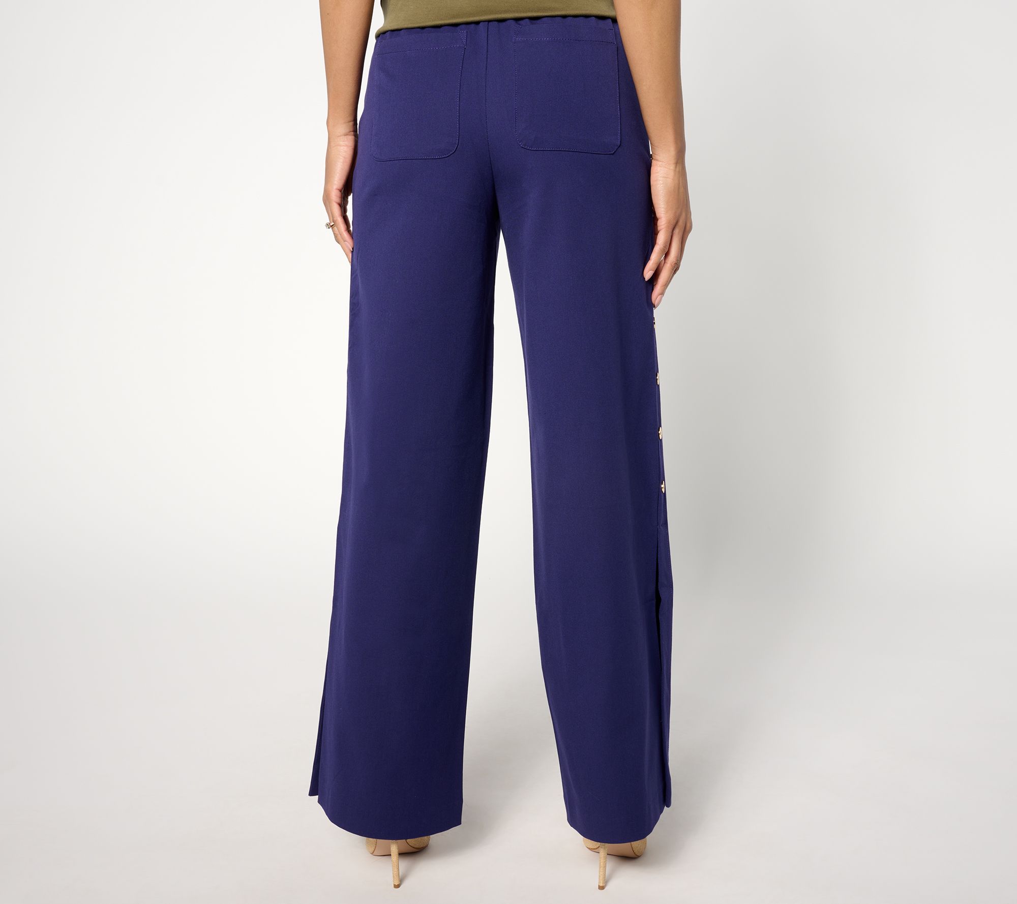 Command attention as soon you as you walk into the room when you're wearing these wide-leg pants. Decorative buttons are an elegant embellishment, giving way to a side slit that shows a hint of your gorgeous gams. From Isaac Mizrahi Live!TM.