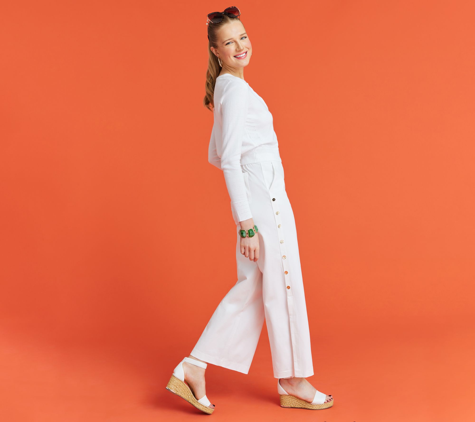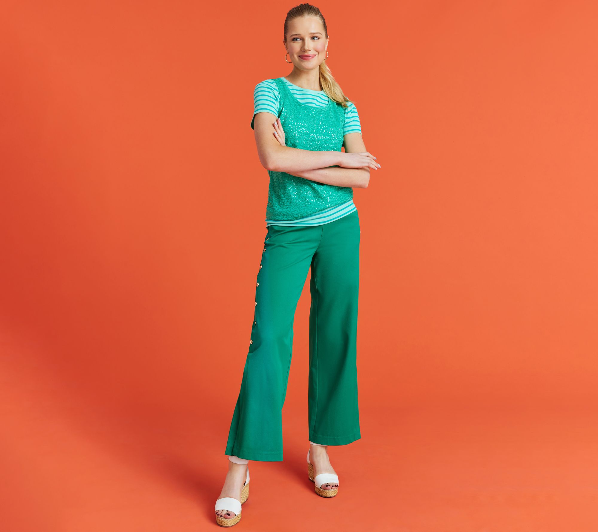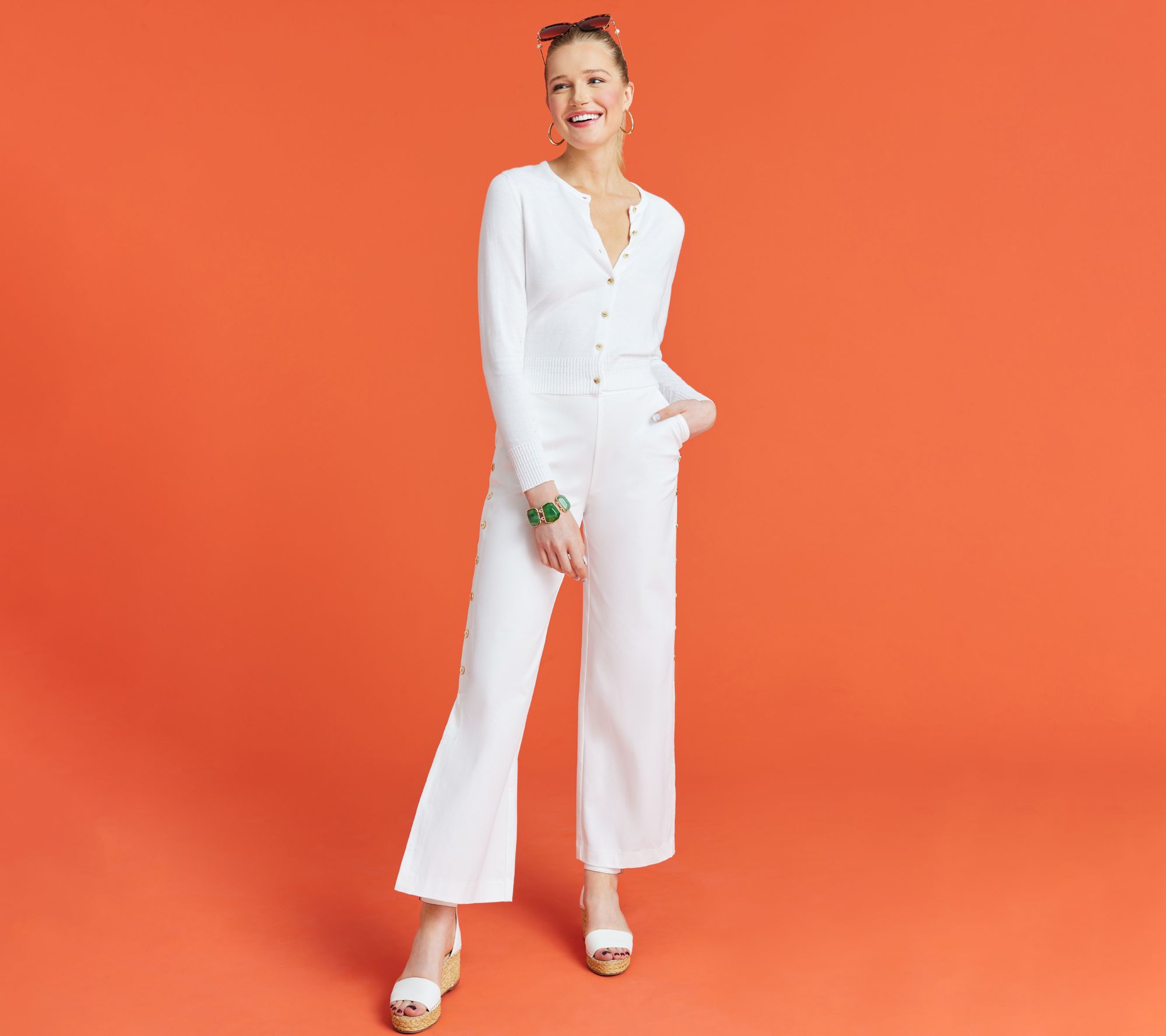 Command attention as soon you as you walk into the room when you're wearing these wide-leg pants. Decorative buttons are an elegant embellishment, giving way to a side slit that shows a hint of your gorgeous gams. From Isaac Mizrahi Live!TM.