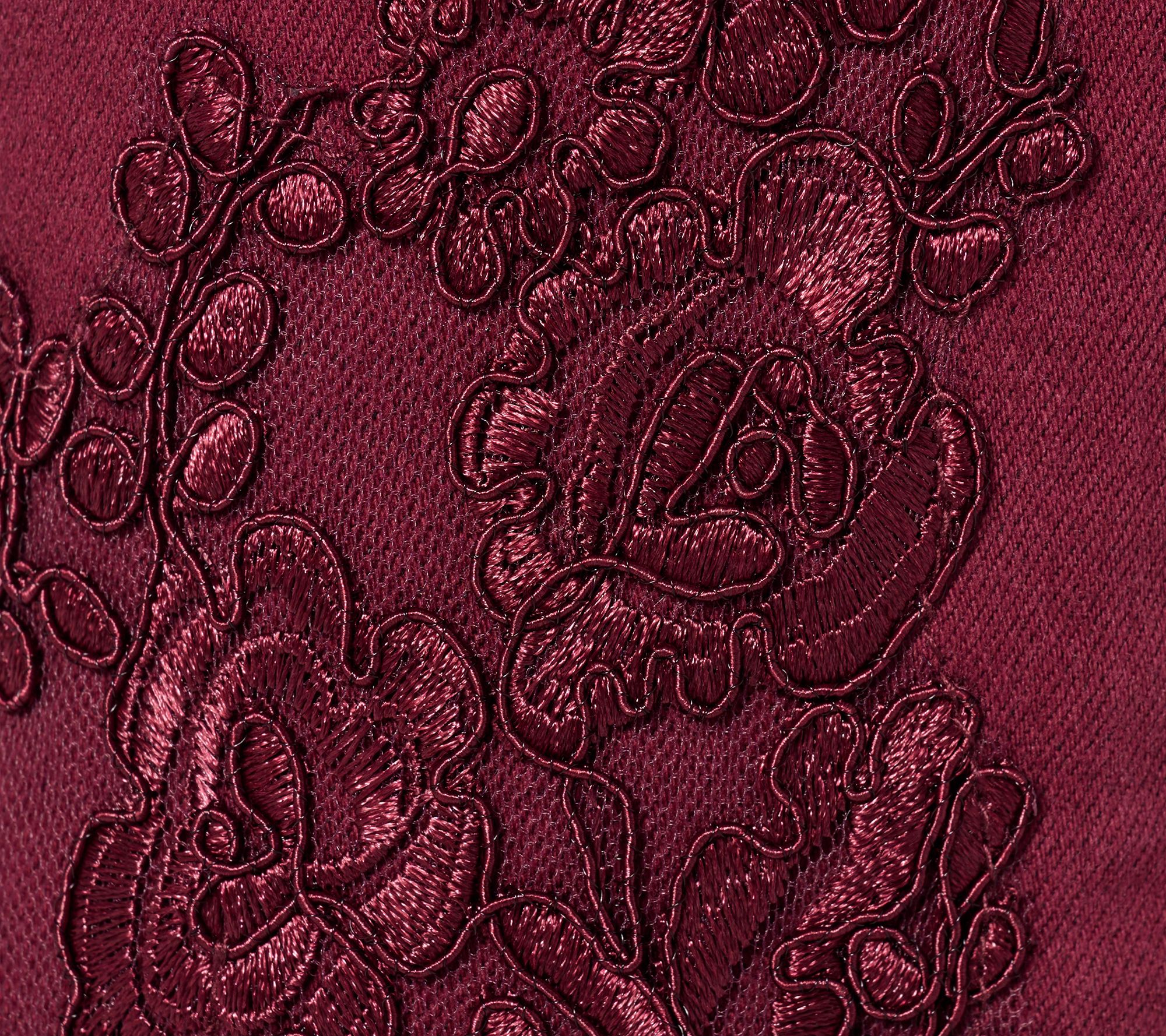 Features: pull-on style, encased elastic waistband, built-in apron for stomach smoothing, lace applique at hem, faux fly, five-pocket styling, back yoke