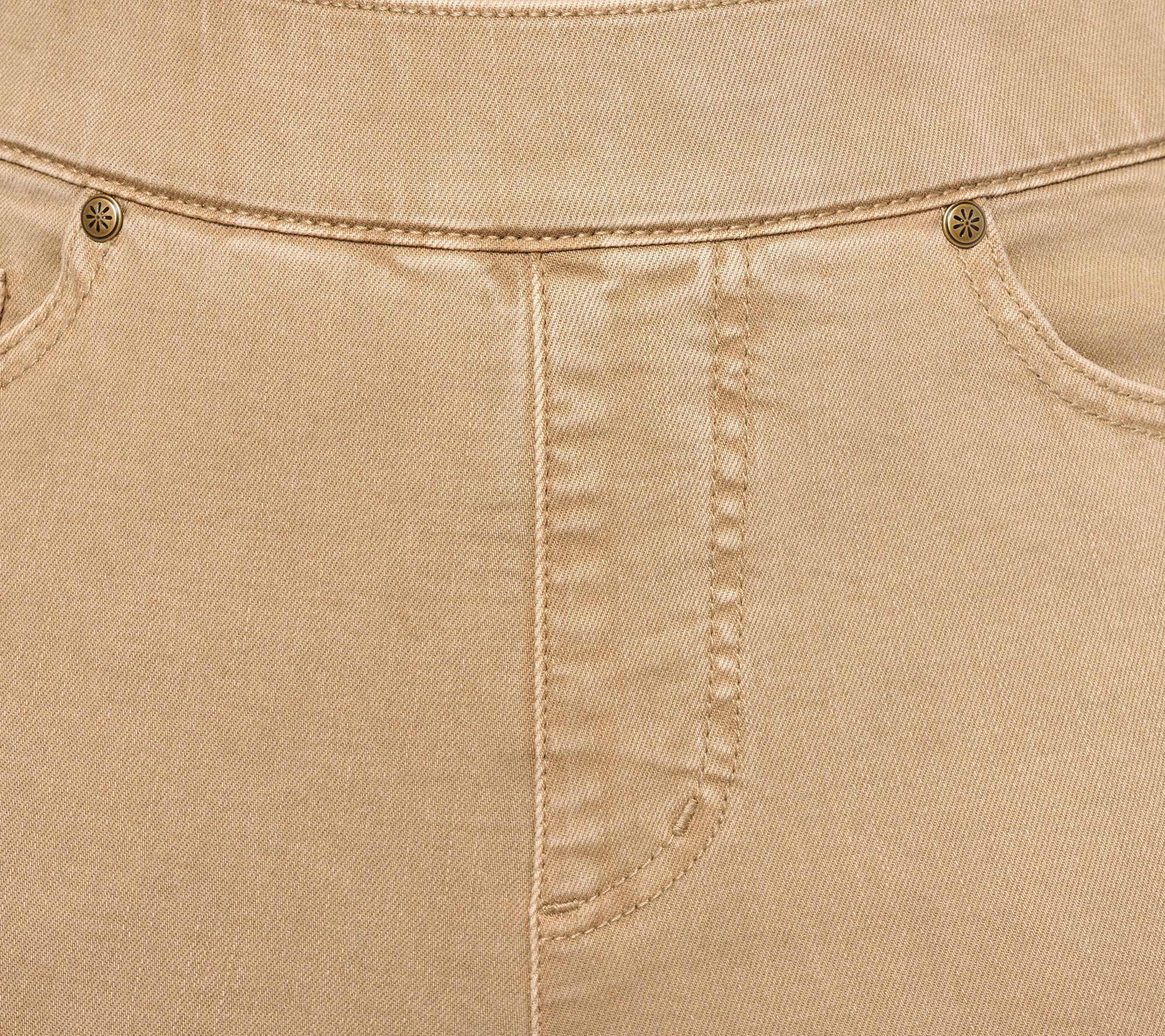 • Features: pull-on style, encased elastic waistband, five-pocket styling, built-in apron with cross-stitching for stomach smoothing, faux fly, deep hem