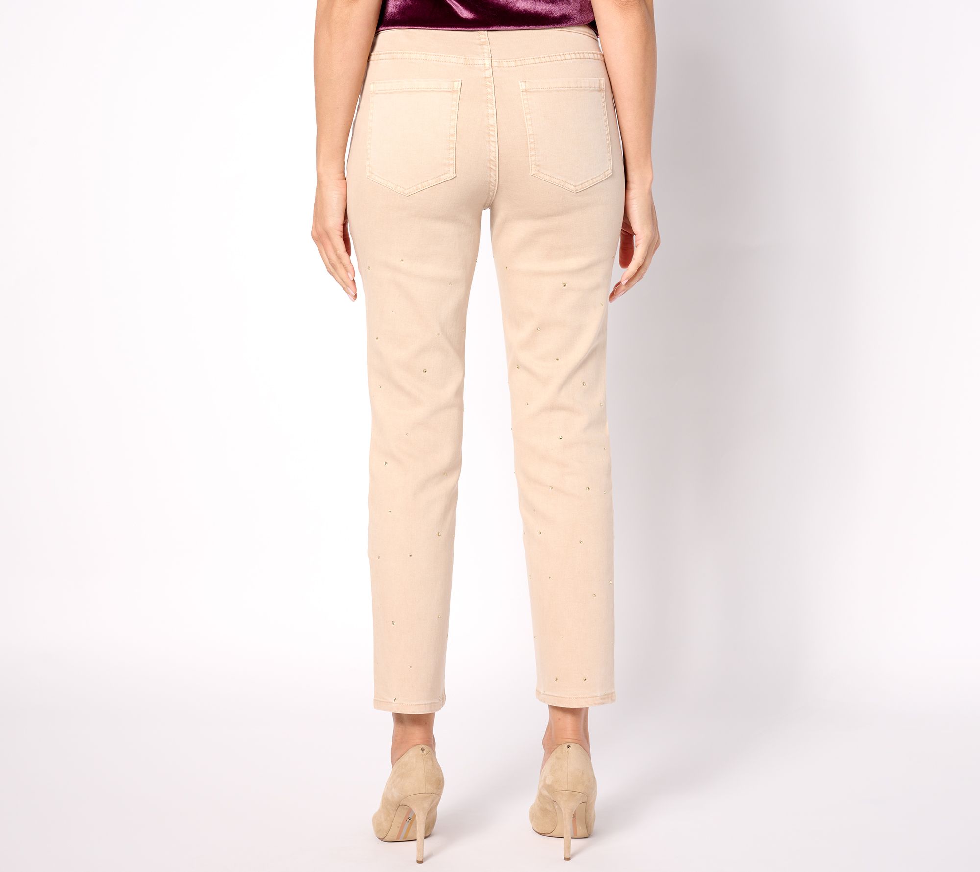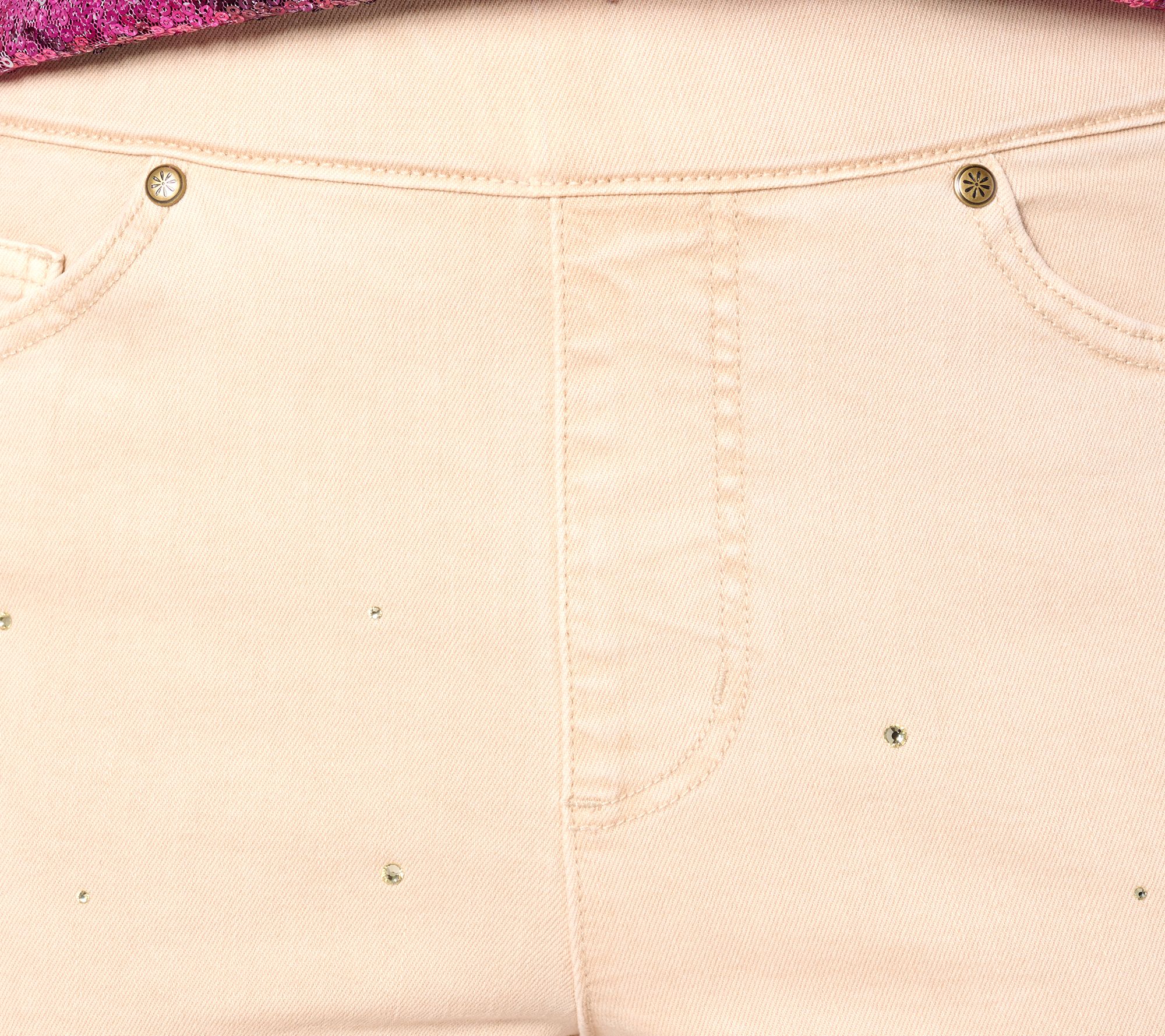 • Features: pull-on style, encased elastic waistband, built-in apron for stomach smoothing, rhinestone embellishment, faux fly, five-pocket styling