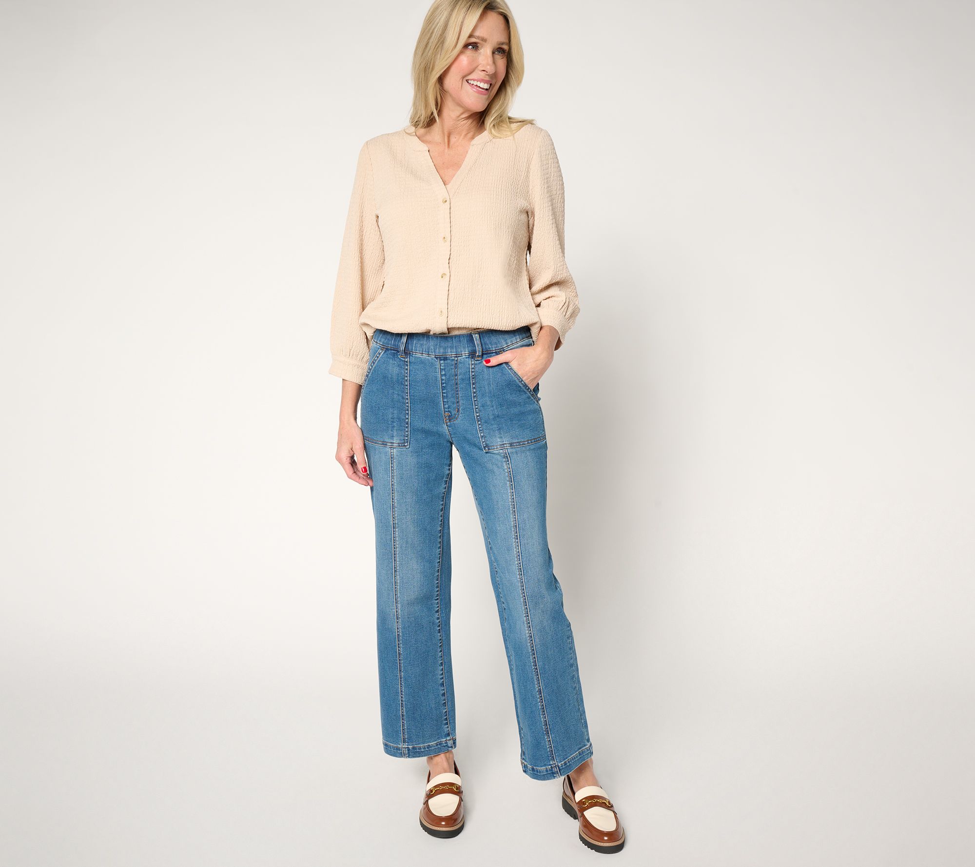 Take your casual days up a notch with these Isaac Mizrahi Live! denim utility jeans. Perfect for running errands or a laid-back brunch, they offer a relaxed straight-leg fit that's both stylish and comfortable. The patch pockets and faux fly detail make them a chic yet functional addition to your wardrobe. From Isaac Mizrahi Live!.