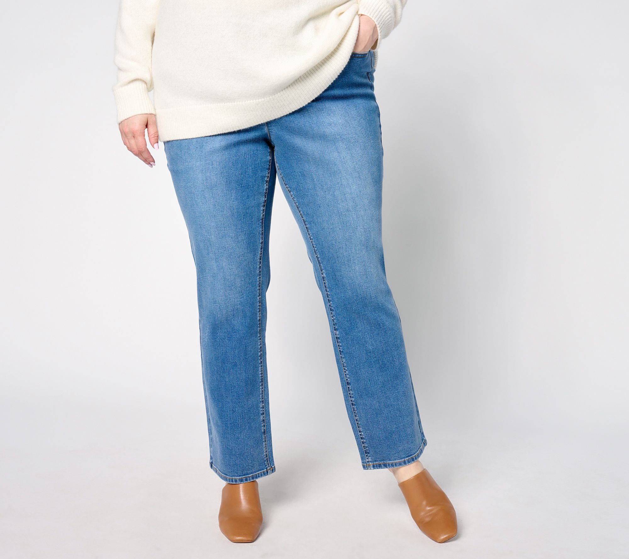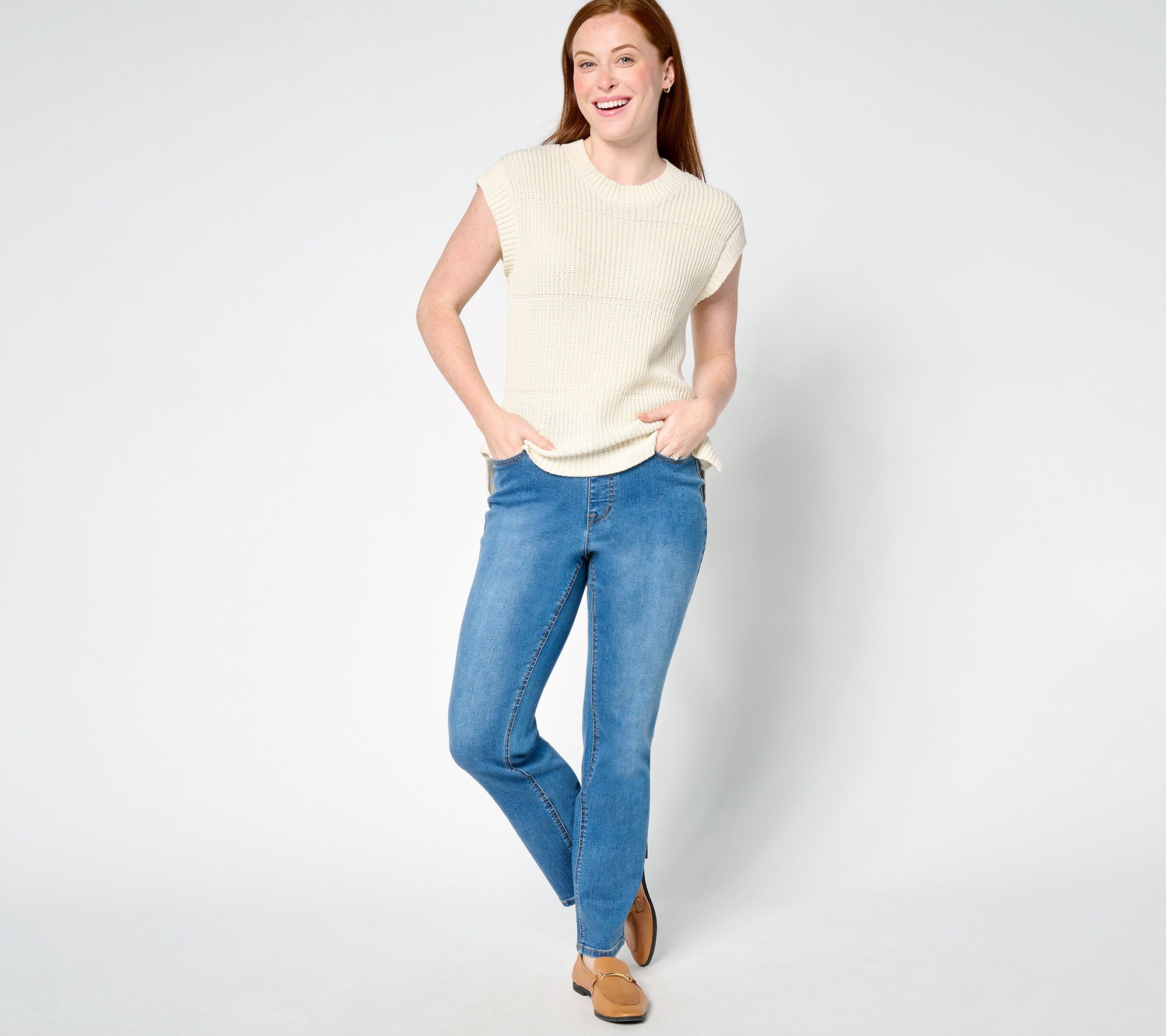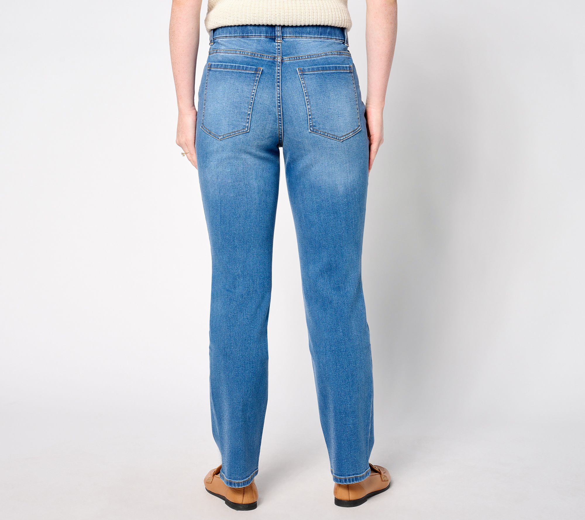 Throw them on and go! A flattering find for any figure, these pull-on True Denim jeans provide a casual chic option in a classic straight-leg design that can be dressed up or down depending on your destination. From Isaac Mizrahi Live!TM.