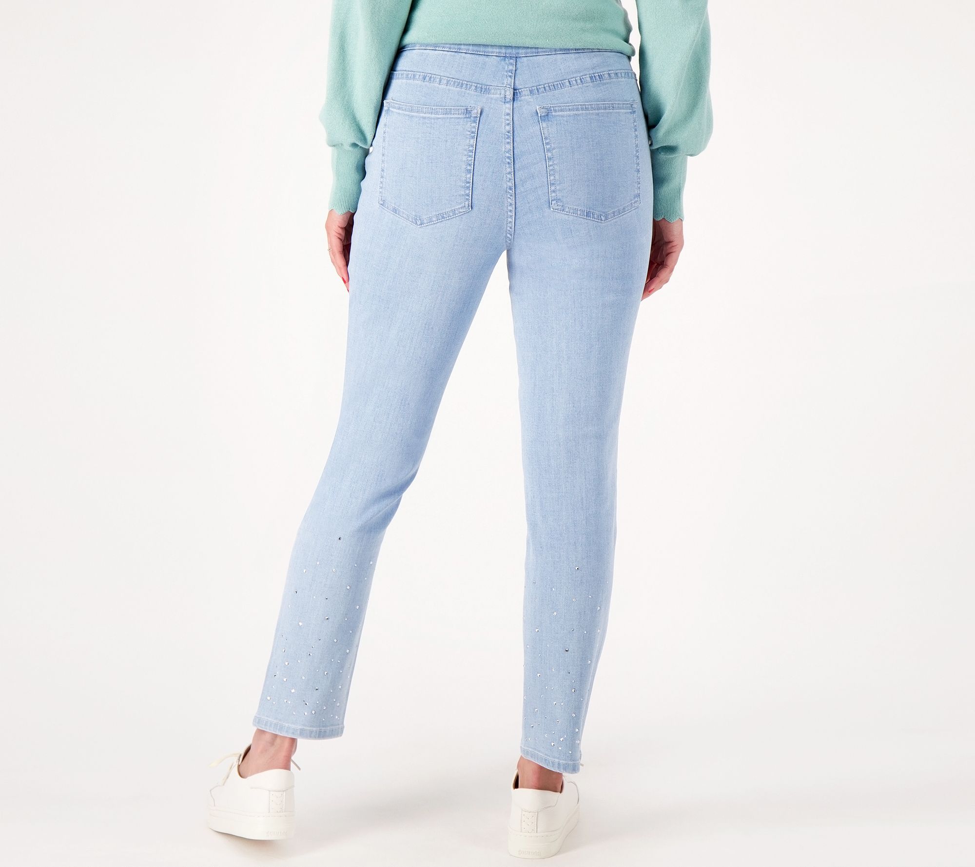 With easy pull-on style and fab rhinestone embellishments, these jeans bring some bling to your everyday look. From Isaac Mizrahi Live!