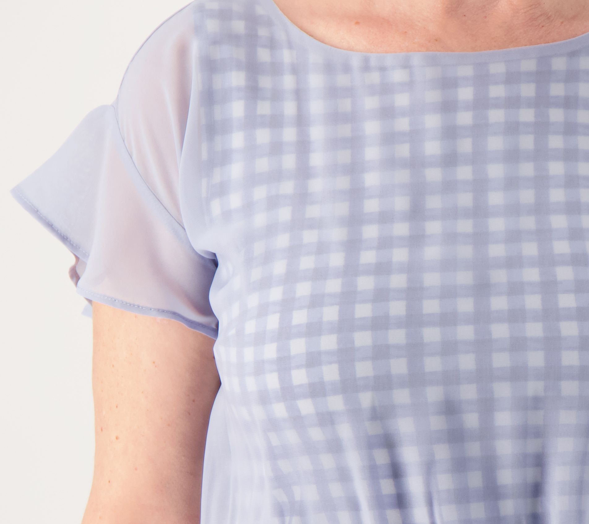- Features: allover print, boat neckline, flutter sleeves, self-knit waistband with encased elastic, swing hemline