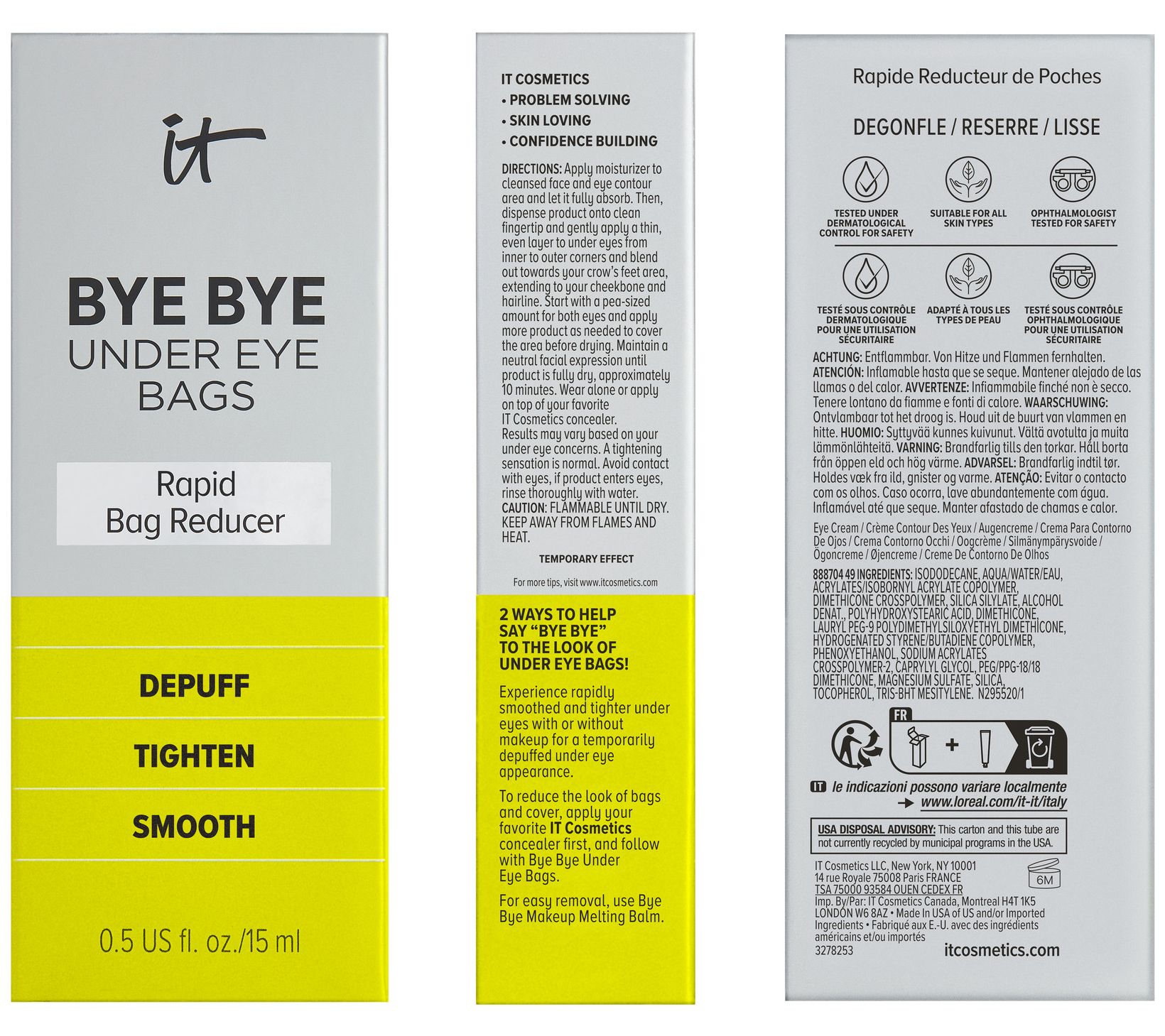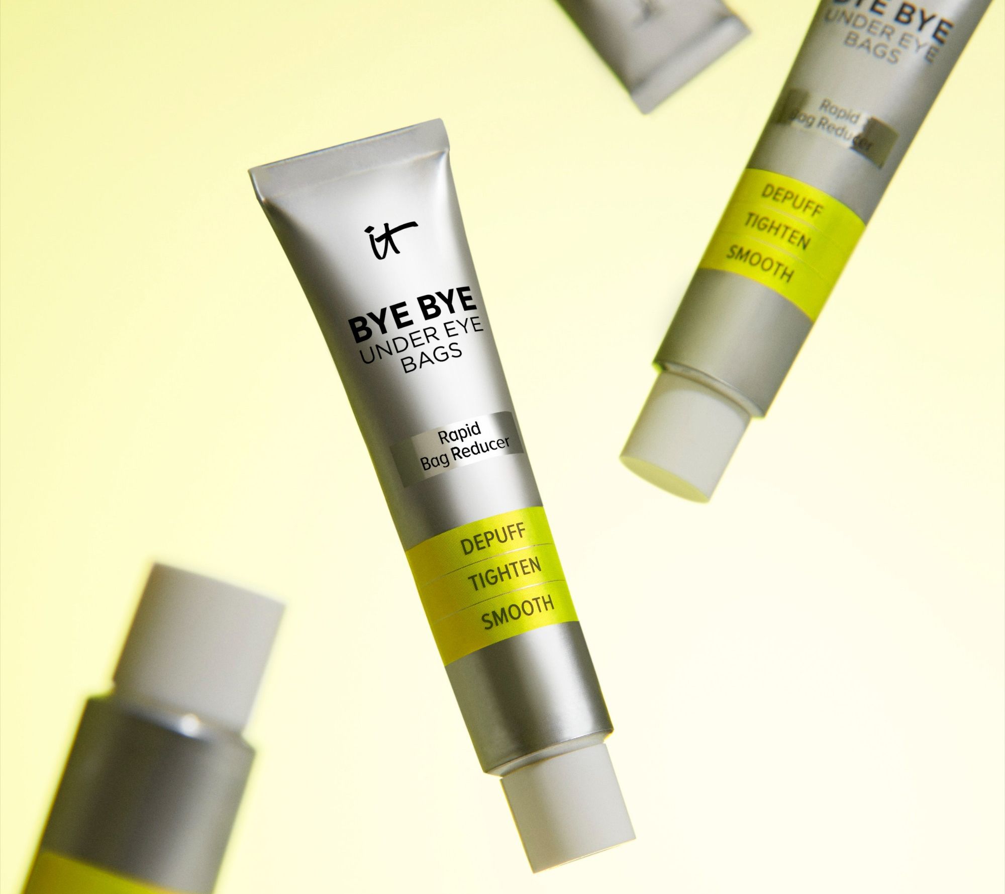 How do I use it: Bye Bye Under Eye Bags Treatment is designed to work when skin is completely dry, so allow two to three minutes for your cleanser and eye cream to fully absorb before applying this product. A pea-sized amount per eye can be applied to bare skin or on top of makeup. Please note: If wearing with concealer, foundation, or powder, Bye Bye Under Eye Bags Treatment needs to be the last product you apply on top in order to work most effectively. With light pressure, use your fingertip to glide evenly from inner to outer eye corners two to three times -- minimal blending is best. Use your fingertip to gently tap or feather the product outward at the edges of each eye. Relax your face and let it go to work. Don't squint or smile until the product is completely dry (about 15 minutes).