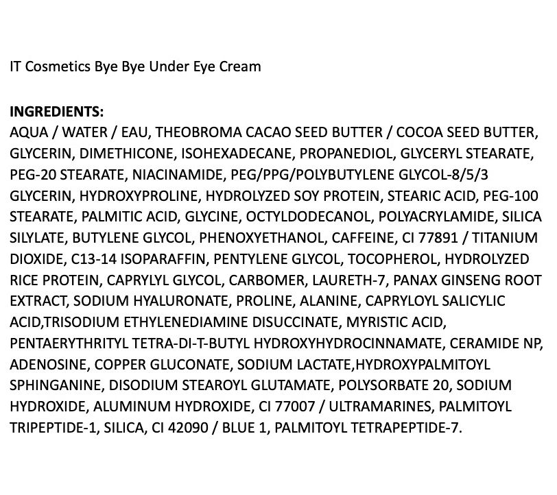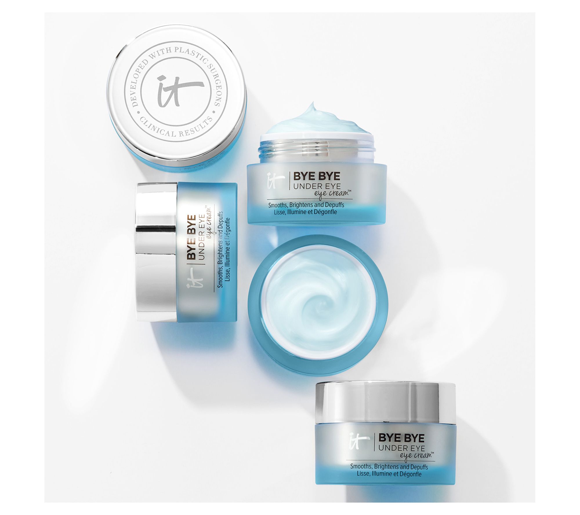 Bye Bye Under Eye Cream from IT Cosmetics is your hydrating, quick-absorbing eye cream. Its creamy, balm-like texture is perfect for layering under makeup. Suitable for all skin types, this multitasking eye cream includes caffeine, hyaluronic acid, and niacinamide, plus ceramides.