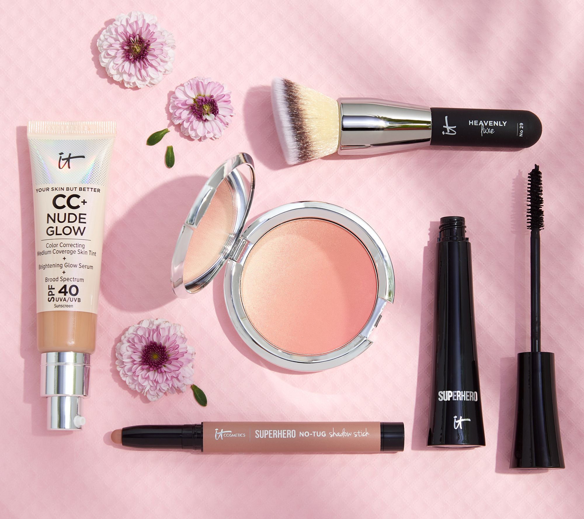 Rec: (1) 1.08fl oz IT Cosmetics CC Nude Glow, (1) 0.38oz Ombre Blush, (1) 0.05oz Superhero Shadow Stick, (1) 0.30oz Superhero Mascara, and (1) Heavenly Luxe Brush #29. Full-Size 5pc Summer Makeup Set! CC Nude Glow is your lightweight foundation w/ built in glow serum! Apply it flawlessly w/ limited edition Heavenly Luxe Foundation Brush. Ombre Radiance Blush in Love delivers pretty soft pink to cheeks. Superhero No Tug Shadow Stick in Bare & Brave is your buildable, blendable, waterproof eyeshadow. Superhero Mascara addresses VOLUME & LENGTH.
