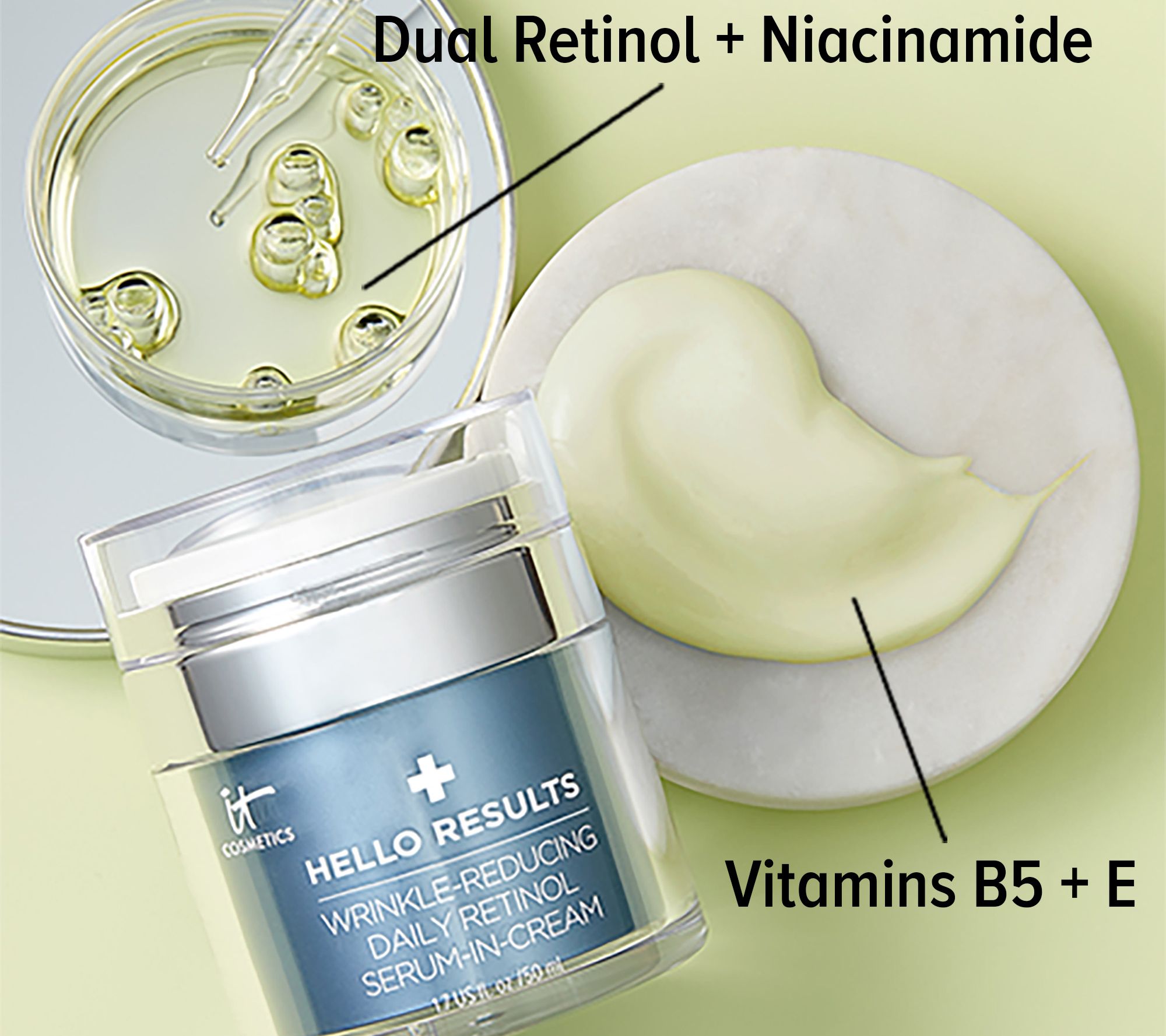 Hello Results Wrinkle-Reducing Daily Retinol Serum-in-Cream combines the anti-aging beauty benefits of a retinol serum with the hydration of a cream to smooth, brighten, and refine the look of your skin. With up to 24 hours hydration, Hello Results helps to improve the appearance of lines, wrinkles, and evenness of skin tone. In one hour, the retinol starts to absorb into skin's surface, reaching 15 layers as found in a tape stripping test. Containing niacinamide and vitamins E, B3, and B5, this formula is gentle enough to be suitable for daily use from day one on all skin types -- even if you have sensitive skin.