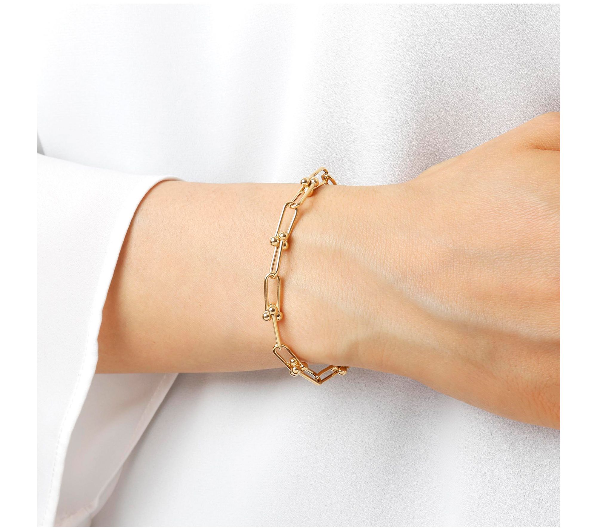 • Interconnected links are rounded on one end with a cluster of beads on the other; polished finish