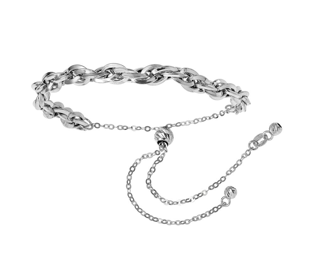 • Interlocking curb links in a slightly twisted design connected to a petite curb link chain; round diamond-cut bead slides to adjust; tiny diamond-cut beads at end