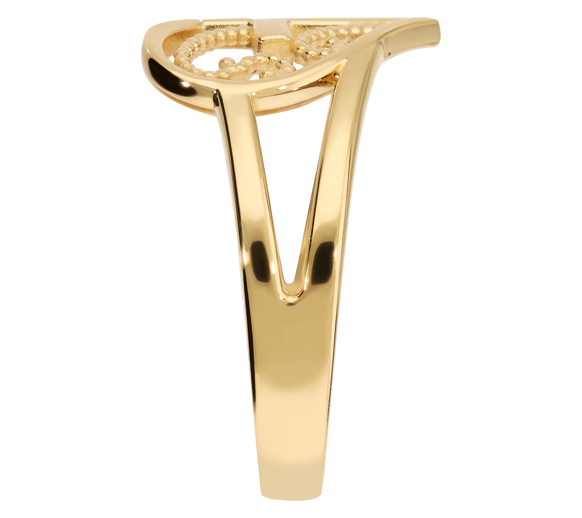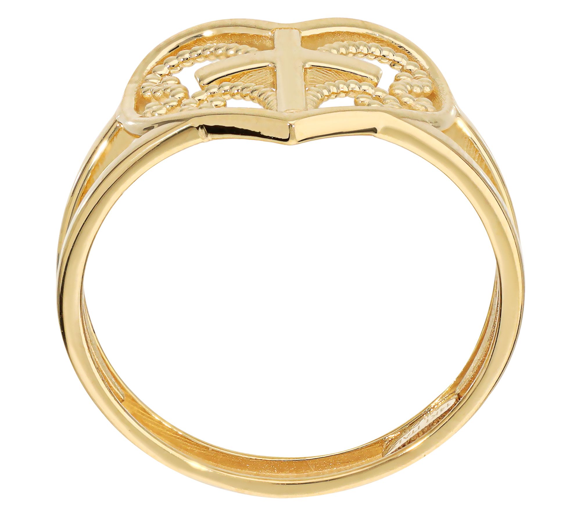 Busy days deserve beautiful moments, and this 14K yellow gold ring delivers just that -- its openwork heart and cross motif add grace to both casual errands and elegant evenings out. Italian artistry shines through every intricate detail, creating a statement of love and faith you can wear every day. From Italian Gold.