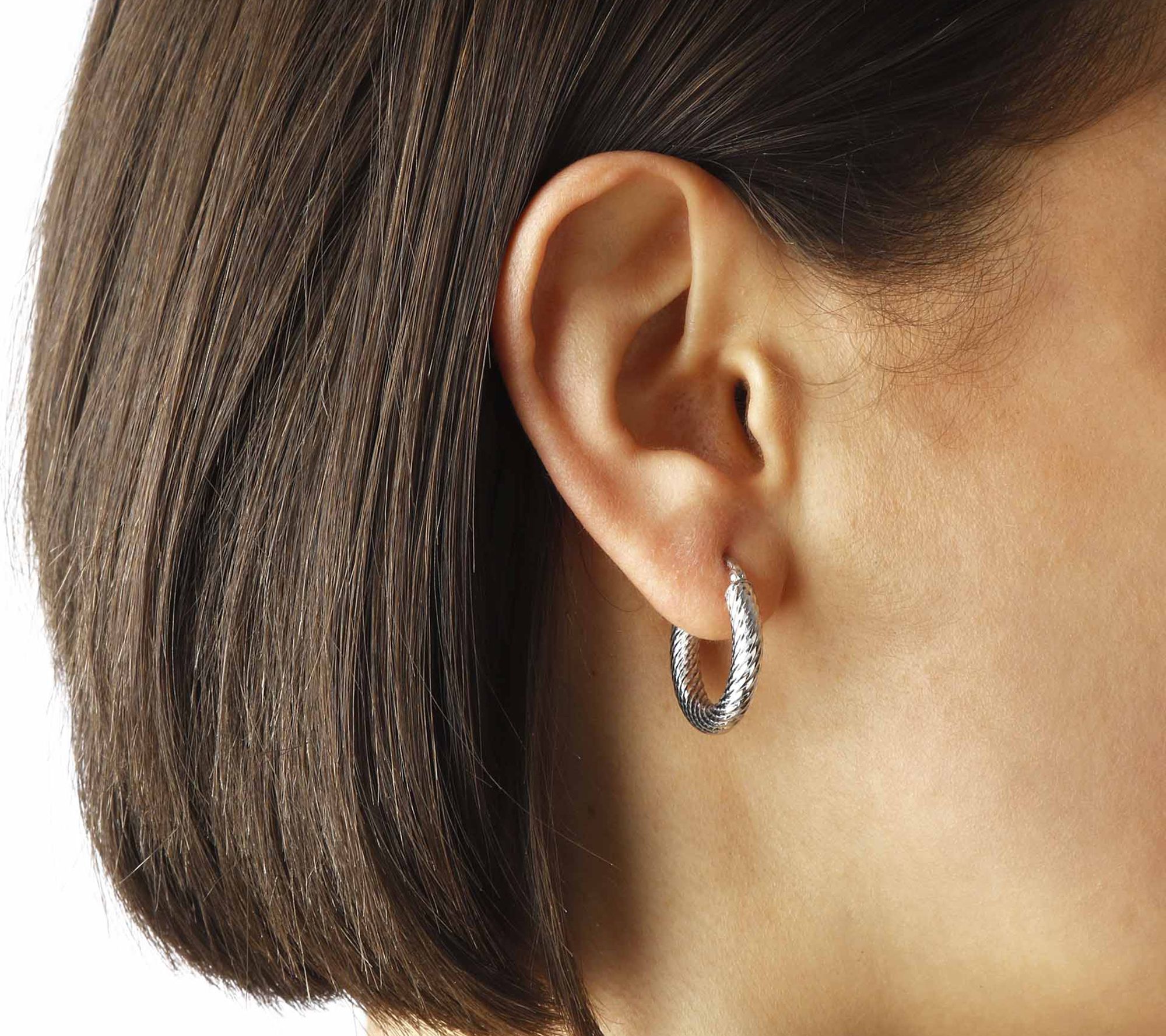 • Round diamond-cut hoops with a twist design