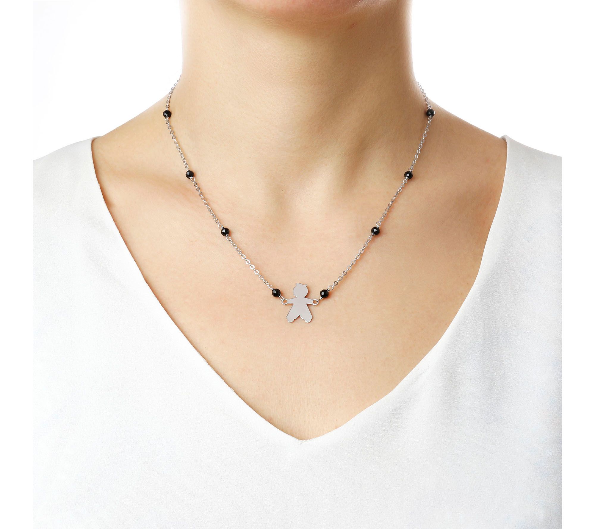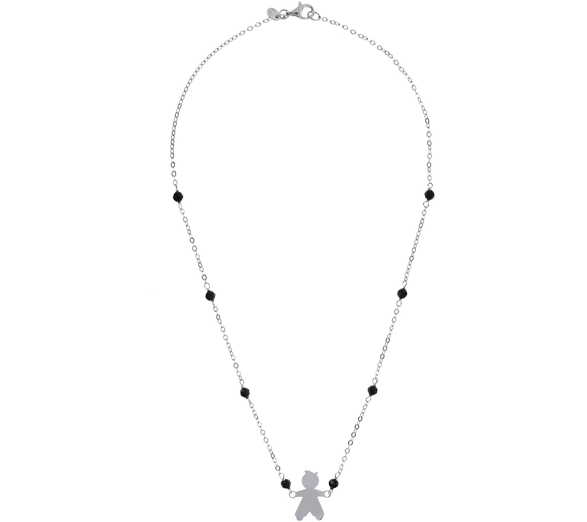 • Child motif in center of oval link chain; faceted black onyx bead stations; polished finish