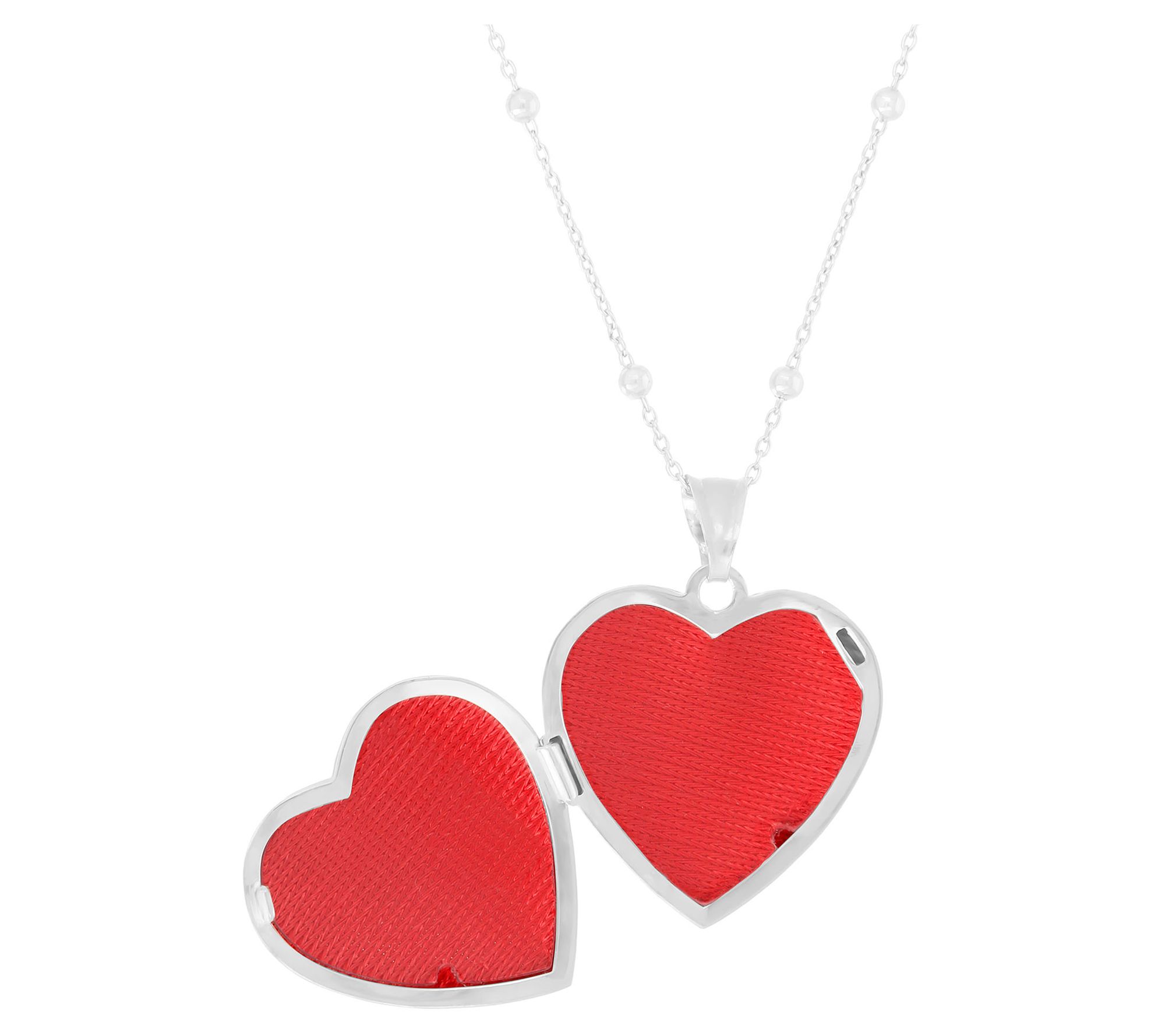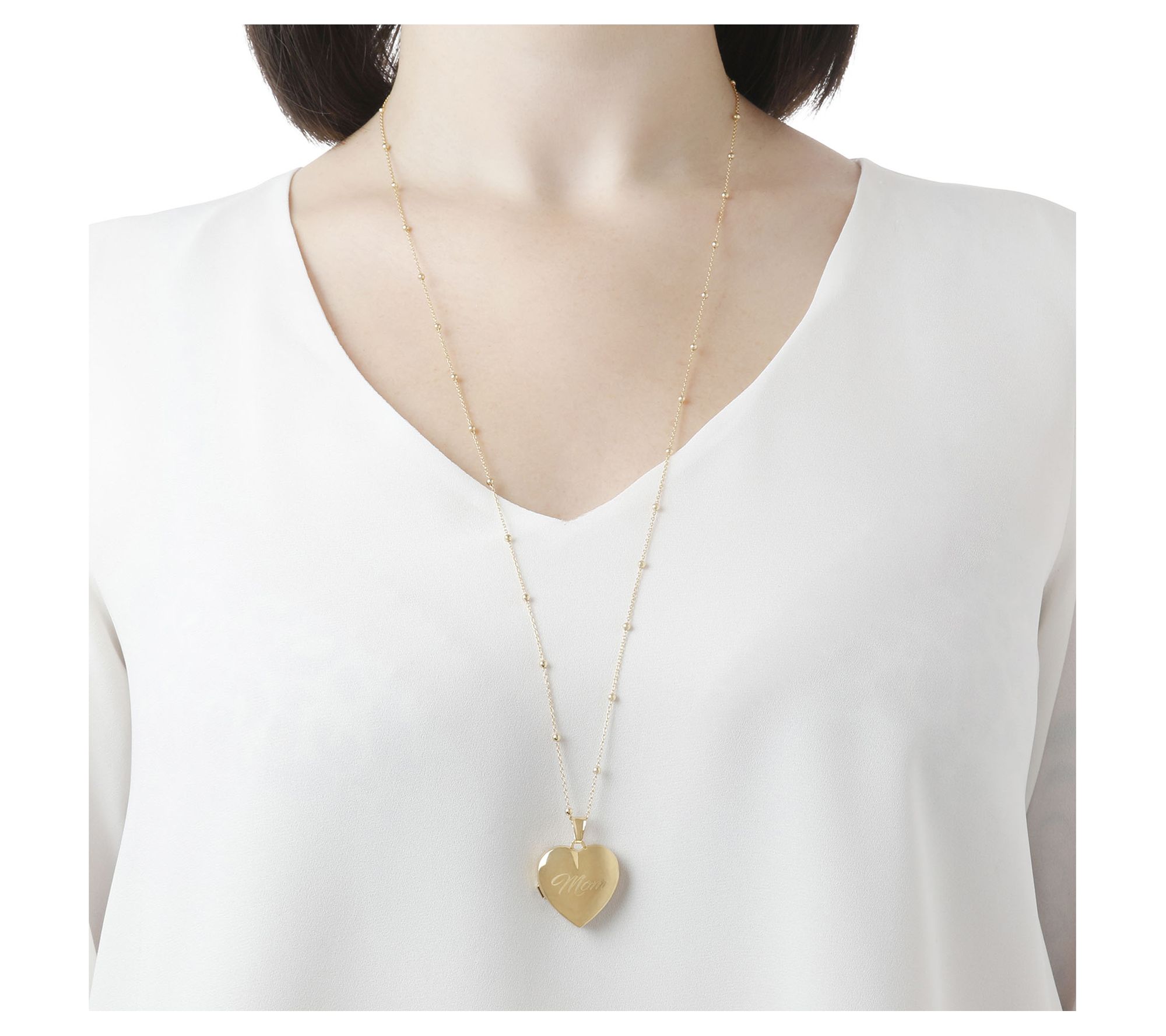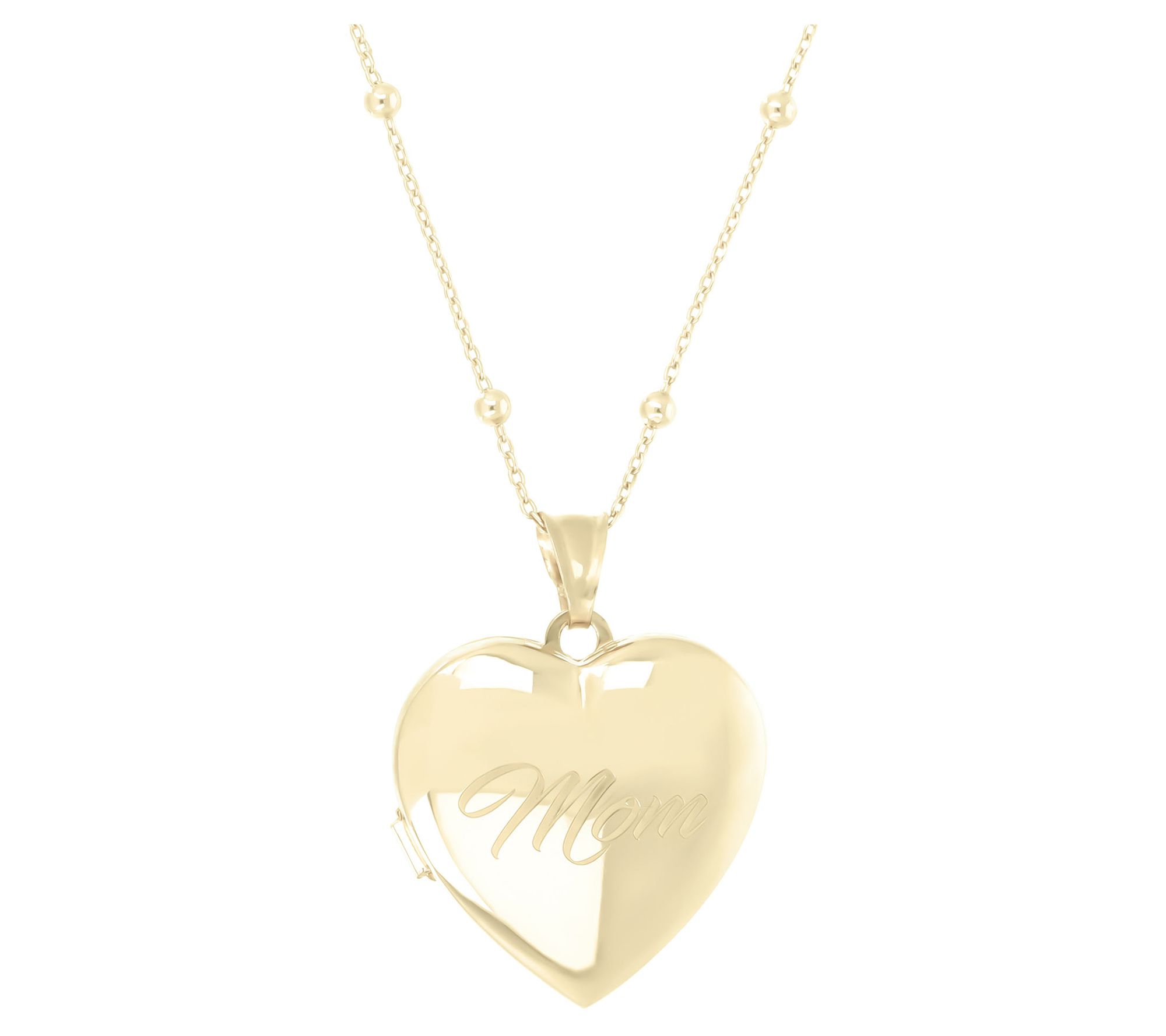 • Polished heart-shaped locket with "Mom" on front; double frames hold two photos inside; oversized movable bail; polished bead stations on chain