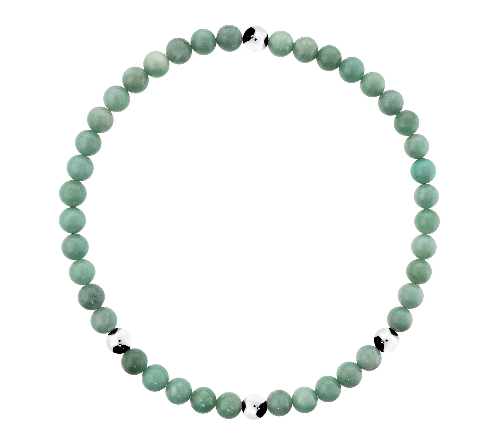 • Round, strung green quartzite beads; three 10mm sterling silver beads; polished finish