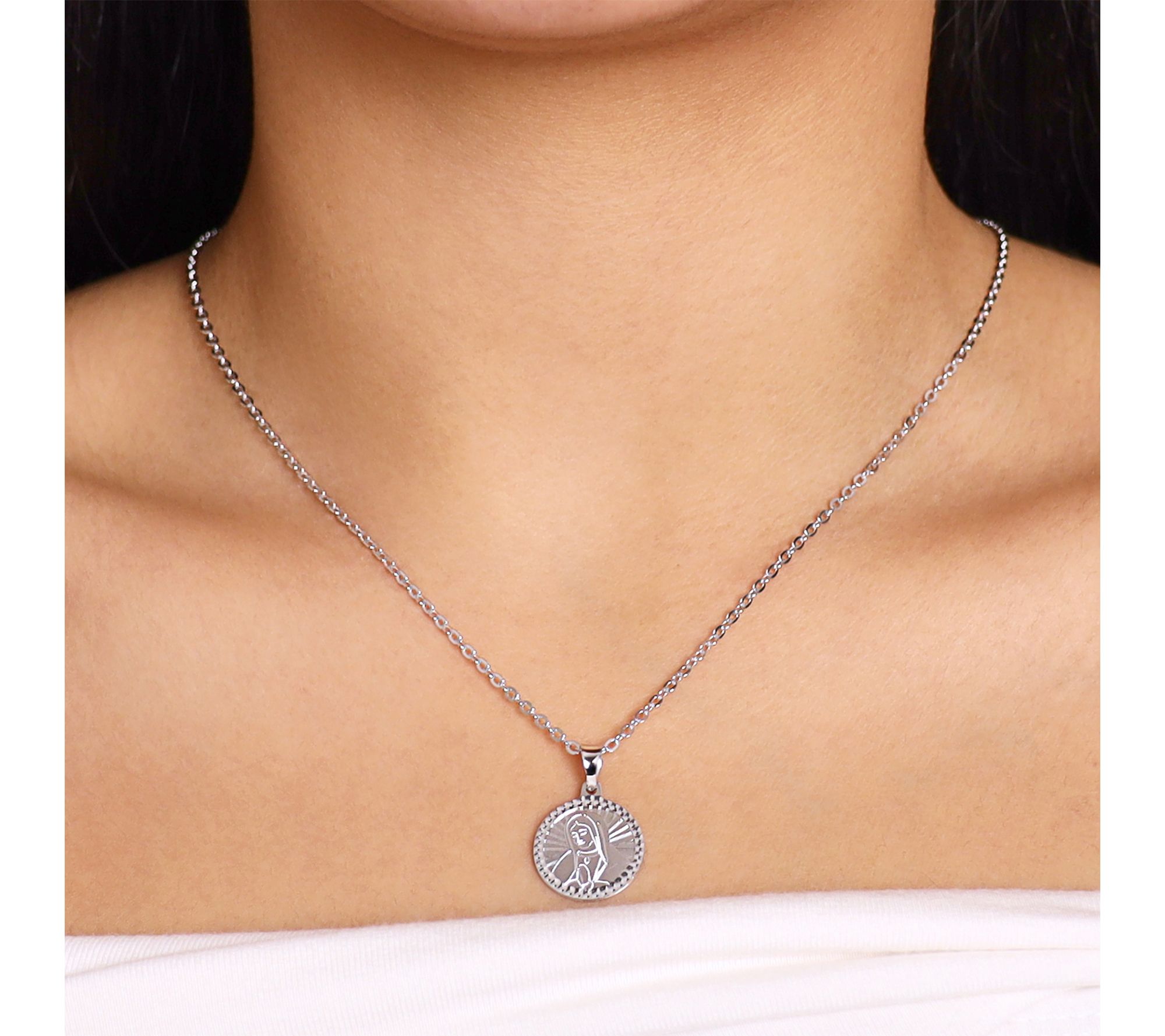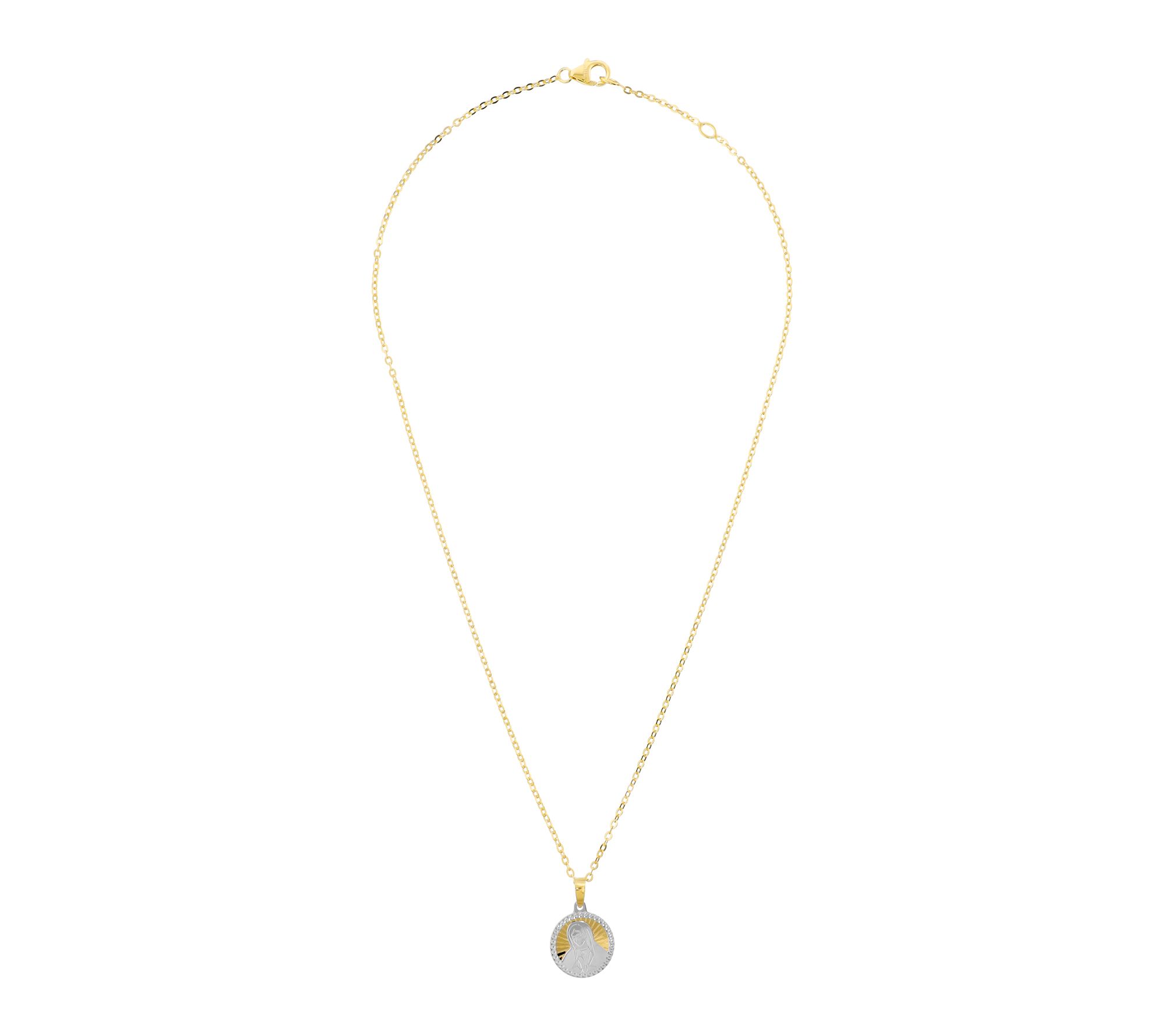 • Round pendant features Mama Mary in praying pose; two-tone option includes 18K yellow gold-plated chain, diamond-cut silver outer ring, and gold-finished inner background; removable pendant; chain