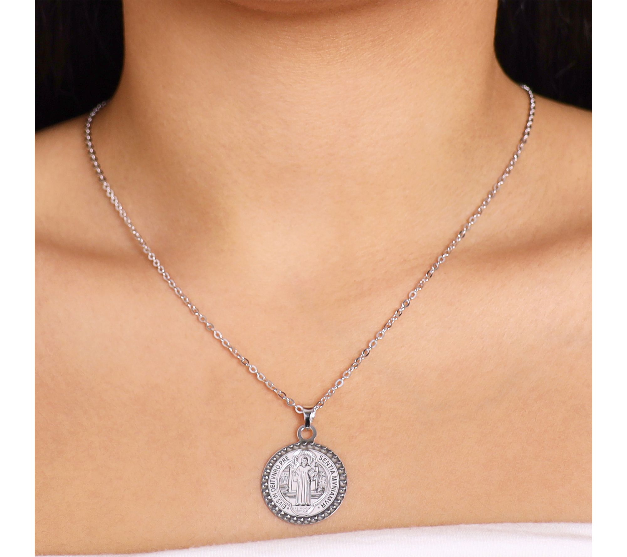 • Round pendant displays image of Saint Benedict on one side; Saint Benedict cross symbol on the reverse; chain