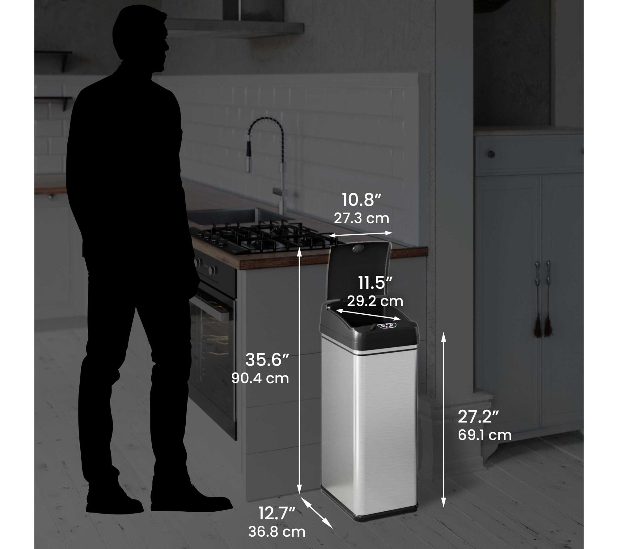 • 13-gallon: deodorizer sensor trash can with sensor lid, deodorizer filter compartment, and activated carbon filter
