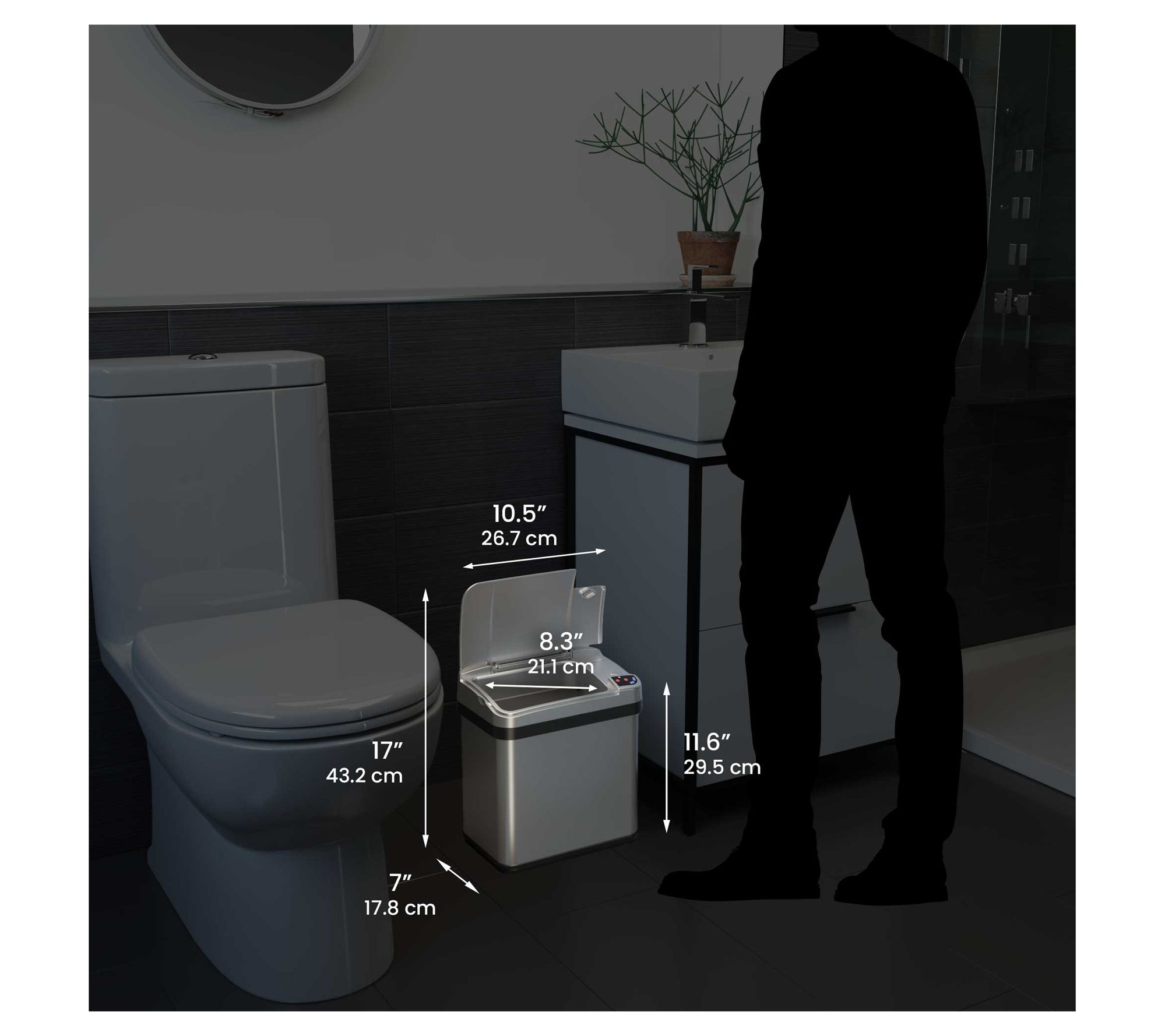 • Measurements: 13-gallon can 12.75"L x 10.75"W x 27.88"H; 2.5-gallon can 7'L x 7"W x 11.75"H