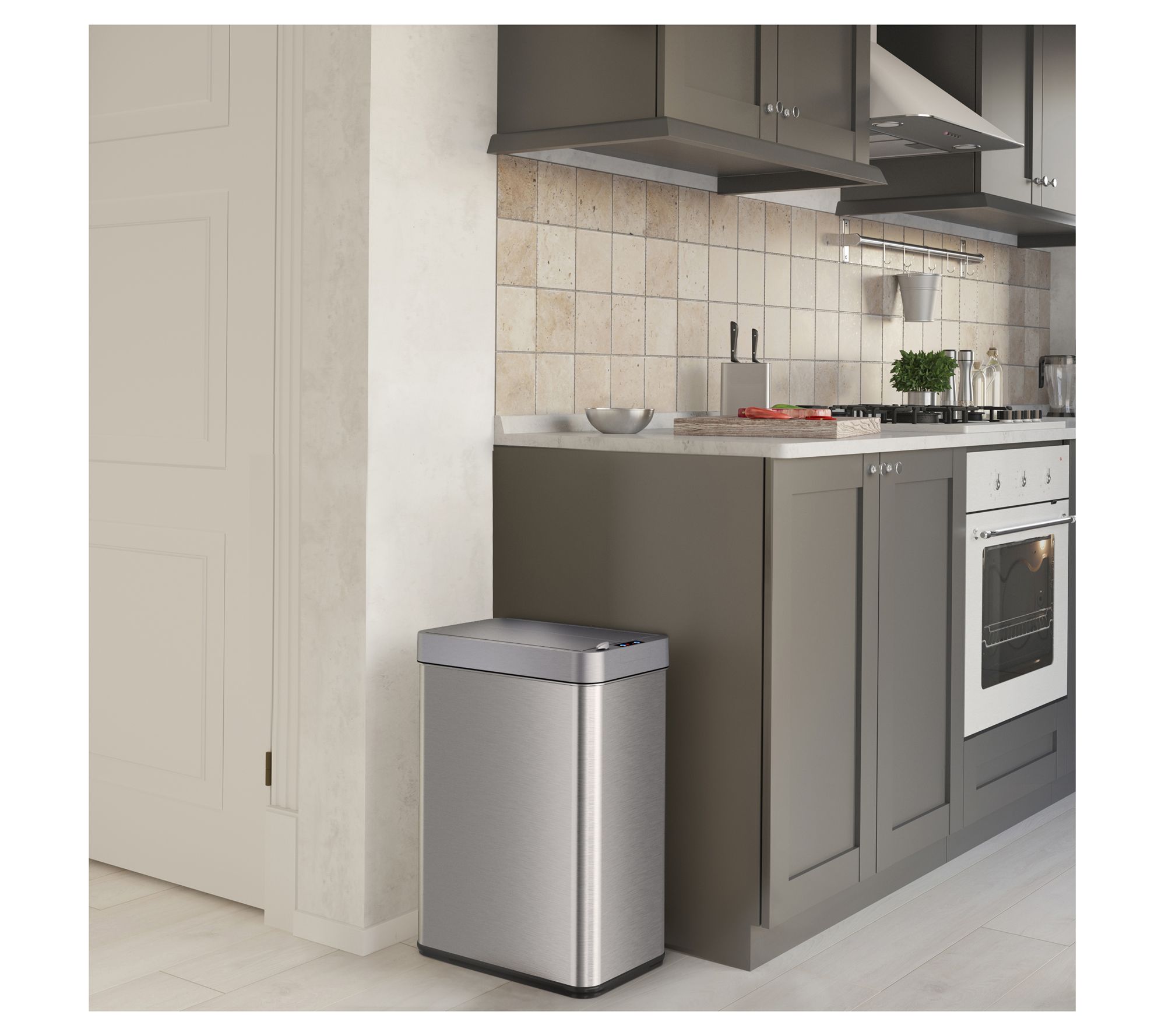 Keep messes at bay with this stainless steel trash can. Gently wave your hand over the motion sensor to open the lid for convenient touchless interaction. From iTouchless.