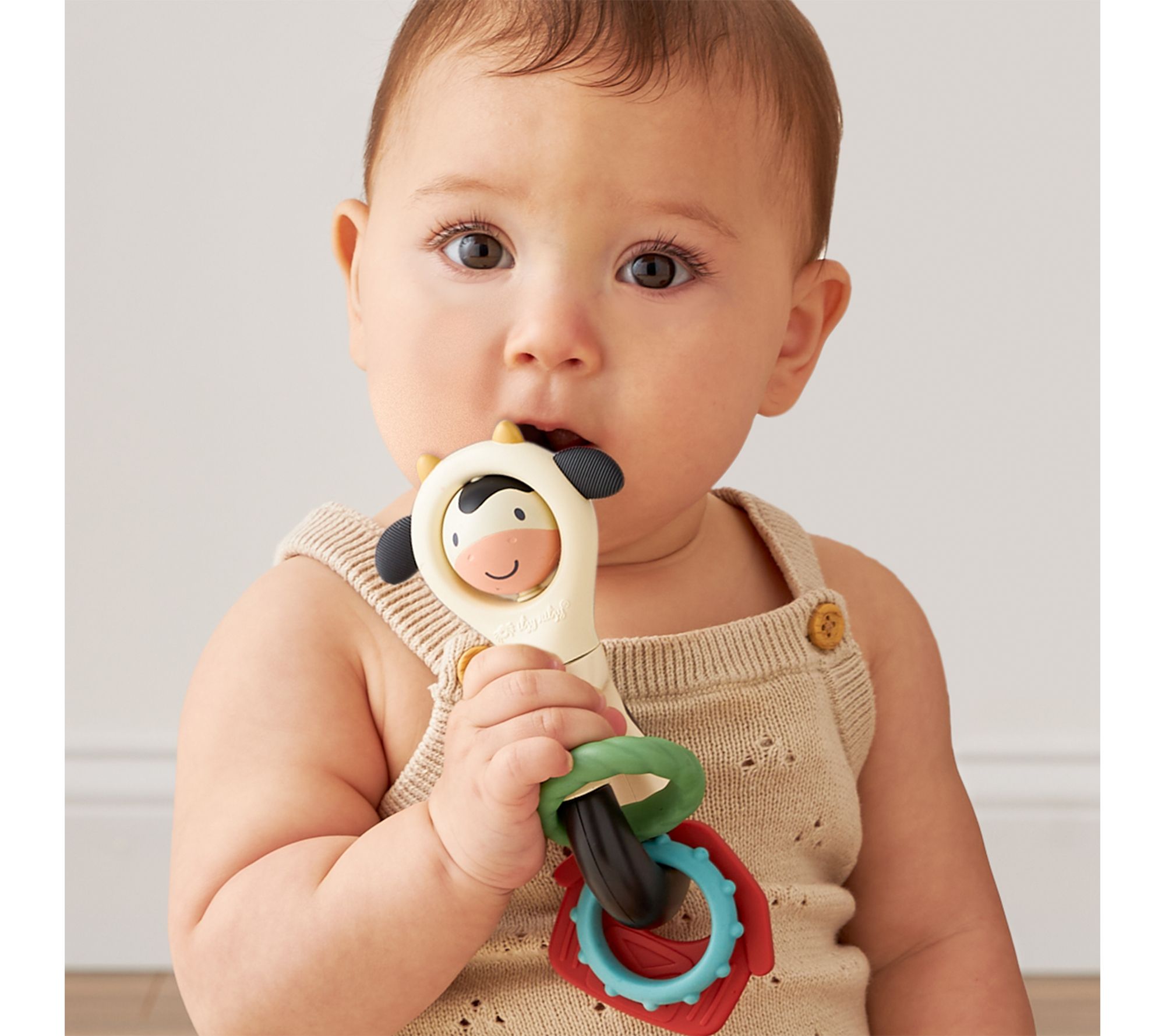 • Textured silicone teether and spinner offer soothing relief for sore gums