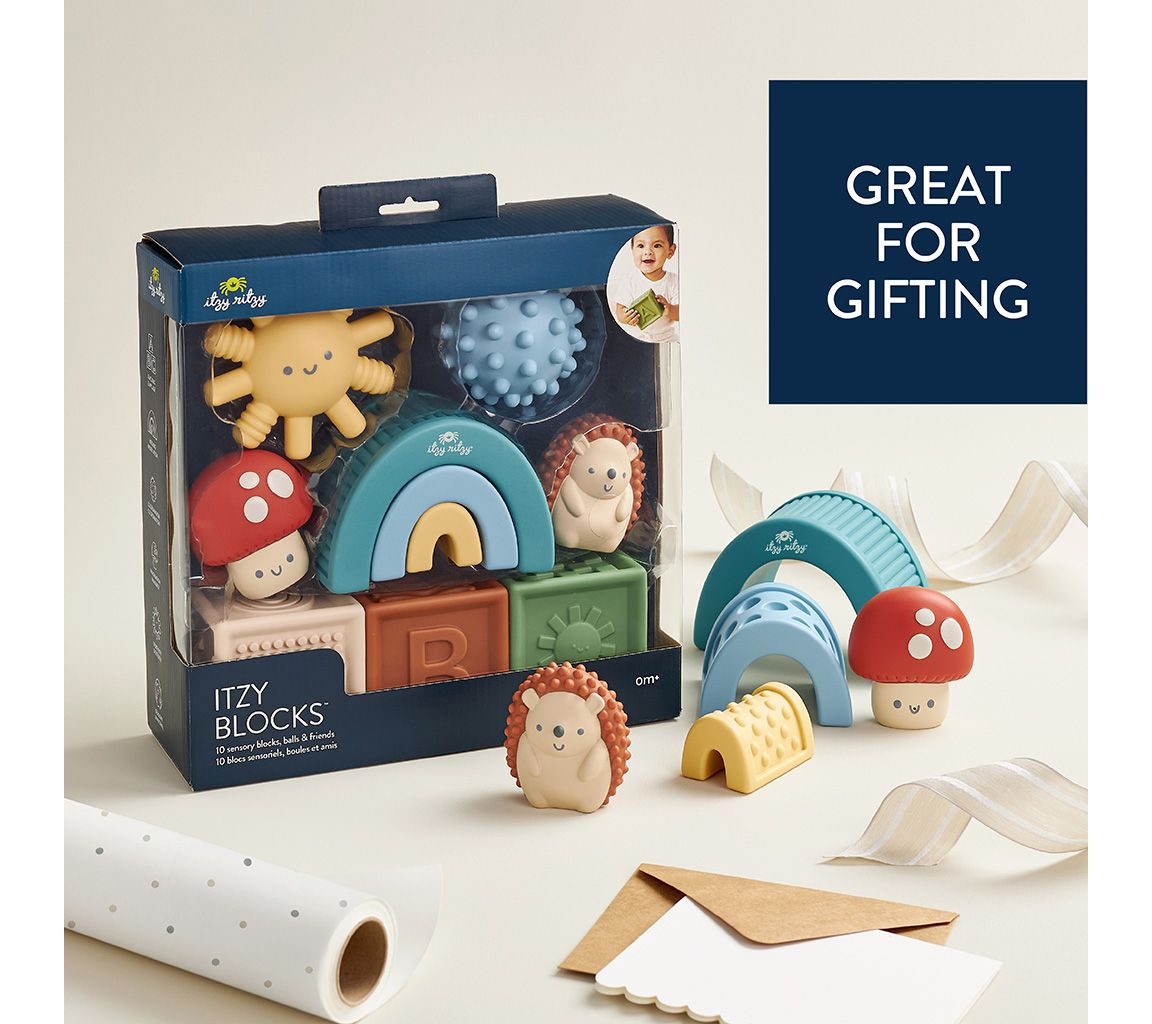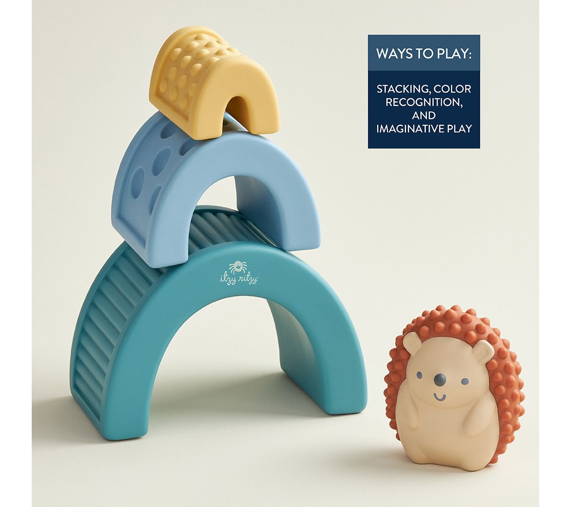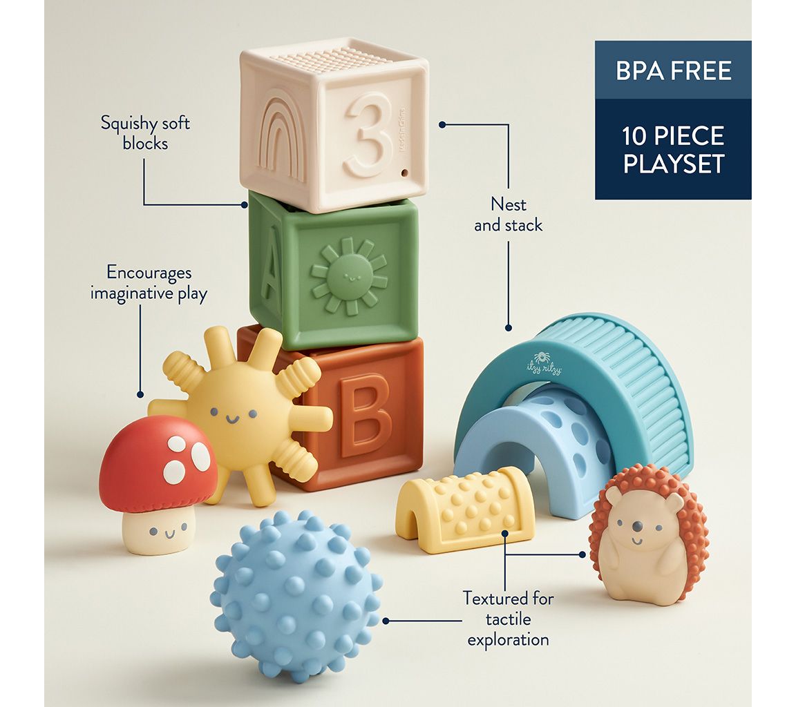 Build your child's creativity with the Itzy Ritzy itzy blocks. This 10-piece play set includes soft, textured blocks and characters designed to engage the senses and inspire imaginative play. Your little one can stack, squeeze, and explore with this colorful playset. From Itzy Ritzy.