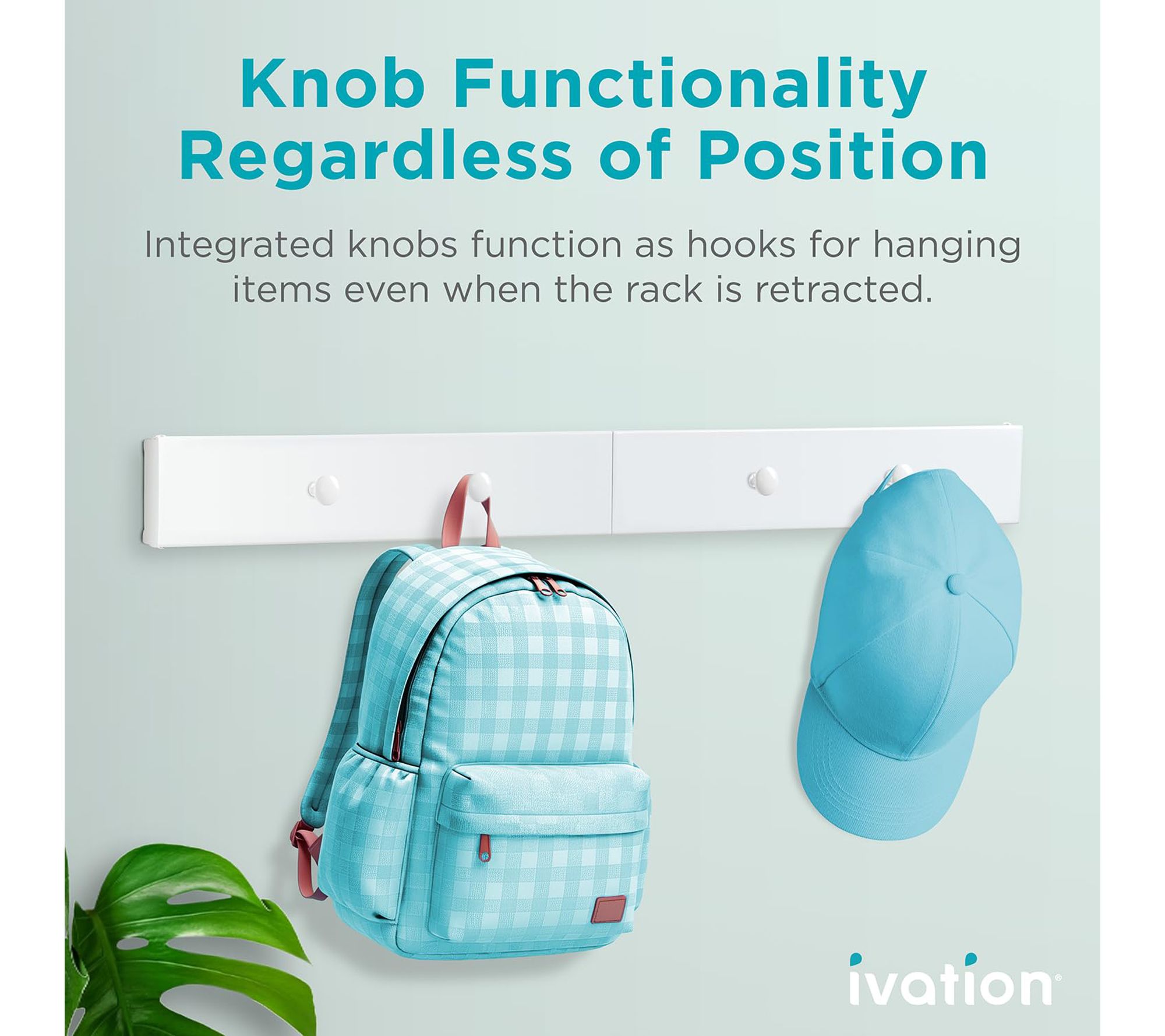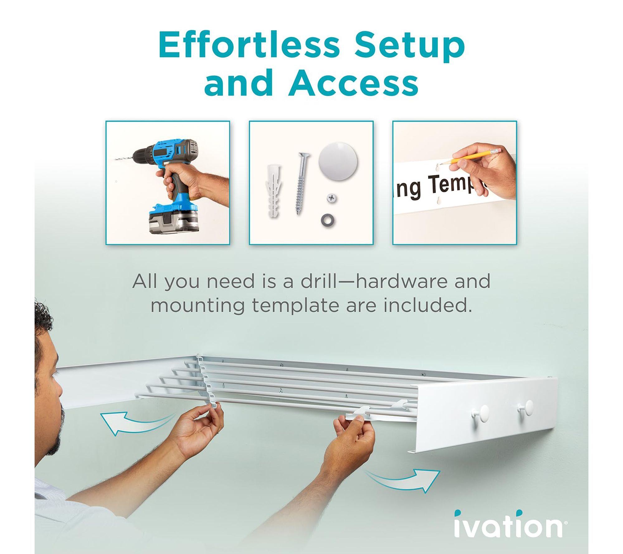 • Includes retractable drying rack, drilling template, hardware kit, 4 hanging hooks, and user guide