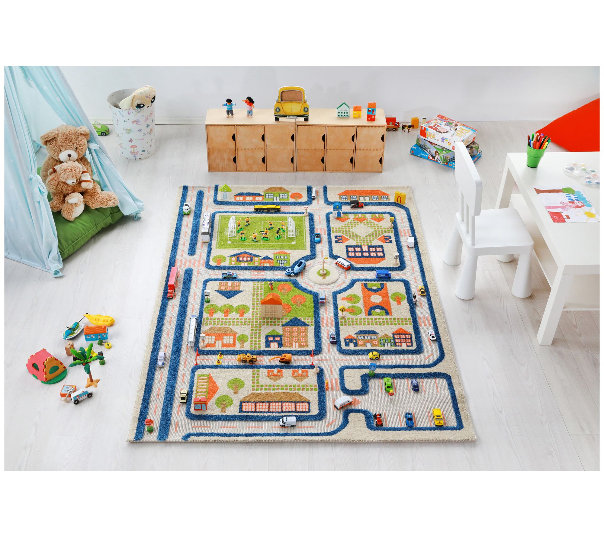Perfect for playrooms or even bedrooms, this 3D play carpet offers your little one hours of imaginative play as they use their own toys to race along each roadway. From IVI.