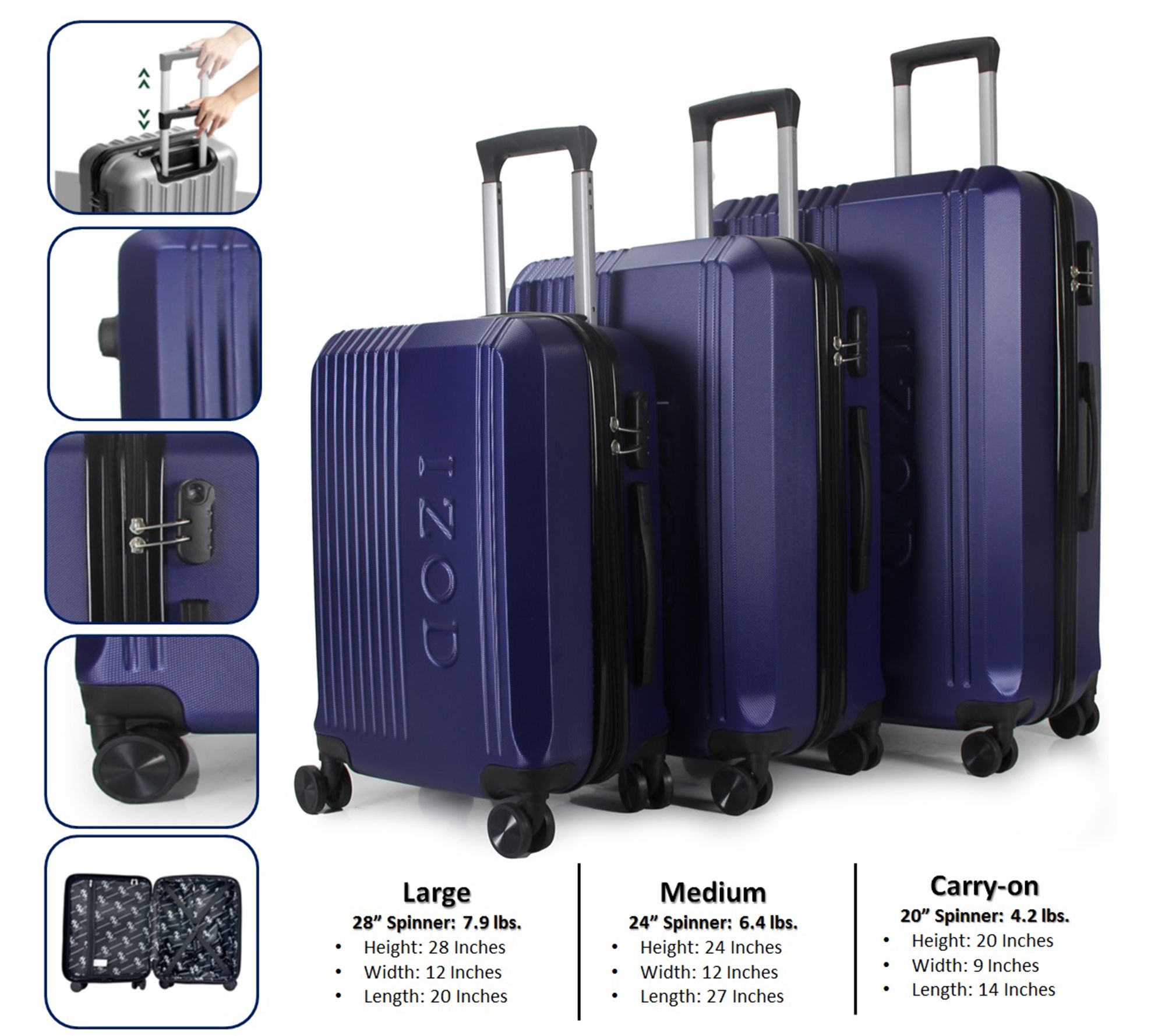 Imagine gliding effortlessly through bustling airports or smoothly navigating city streets with this sleek and durable three-piece luggage set. Perfect for weekend getaways or extended adventures, this versatile set brings style and convenience to your travels. The ergonomic handles and 360-degree spinner wheels make carrying and maneuvering a breeze. Ensure your belongings are secure and organized with ample compartments and robust locks. From Izod.