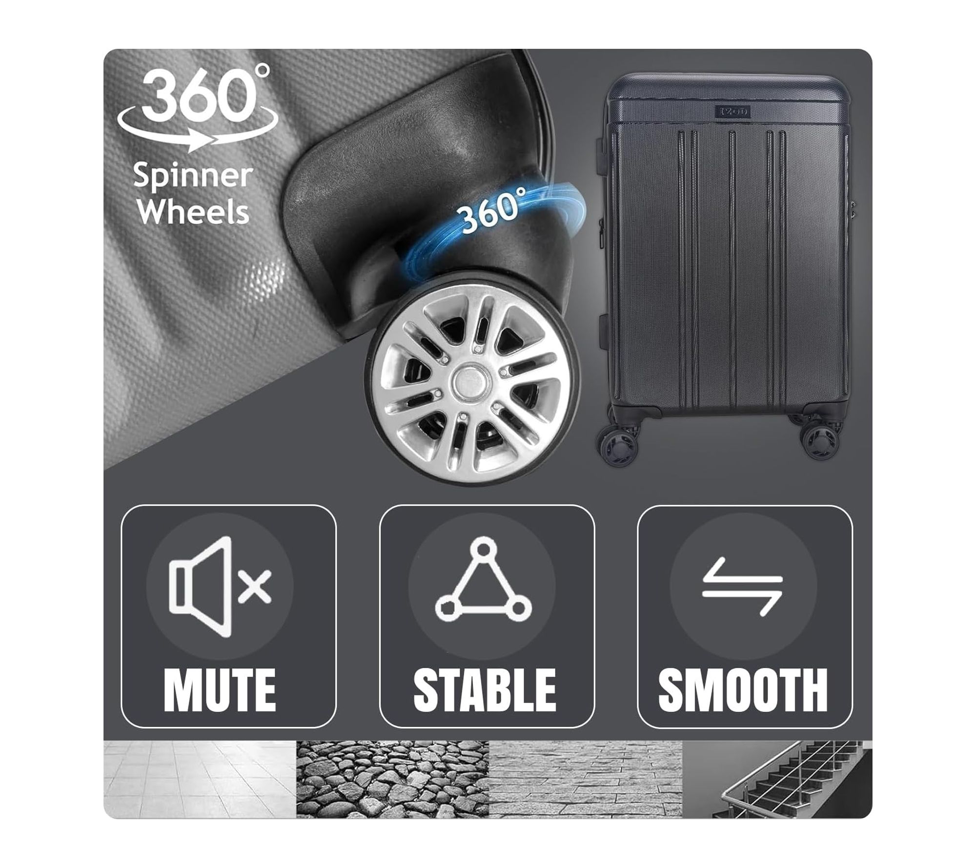 • ABS hard-shell exterior; four 360-degree spinner wheels