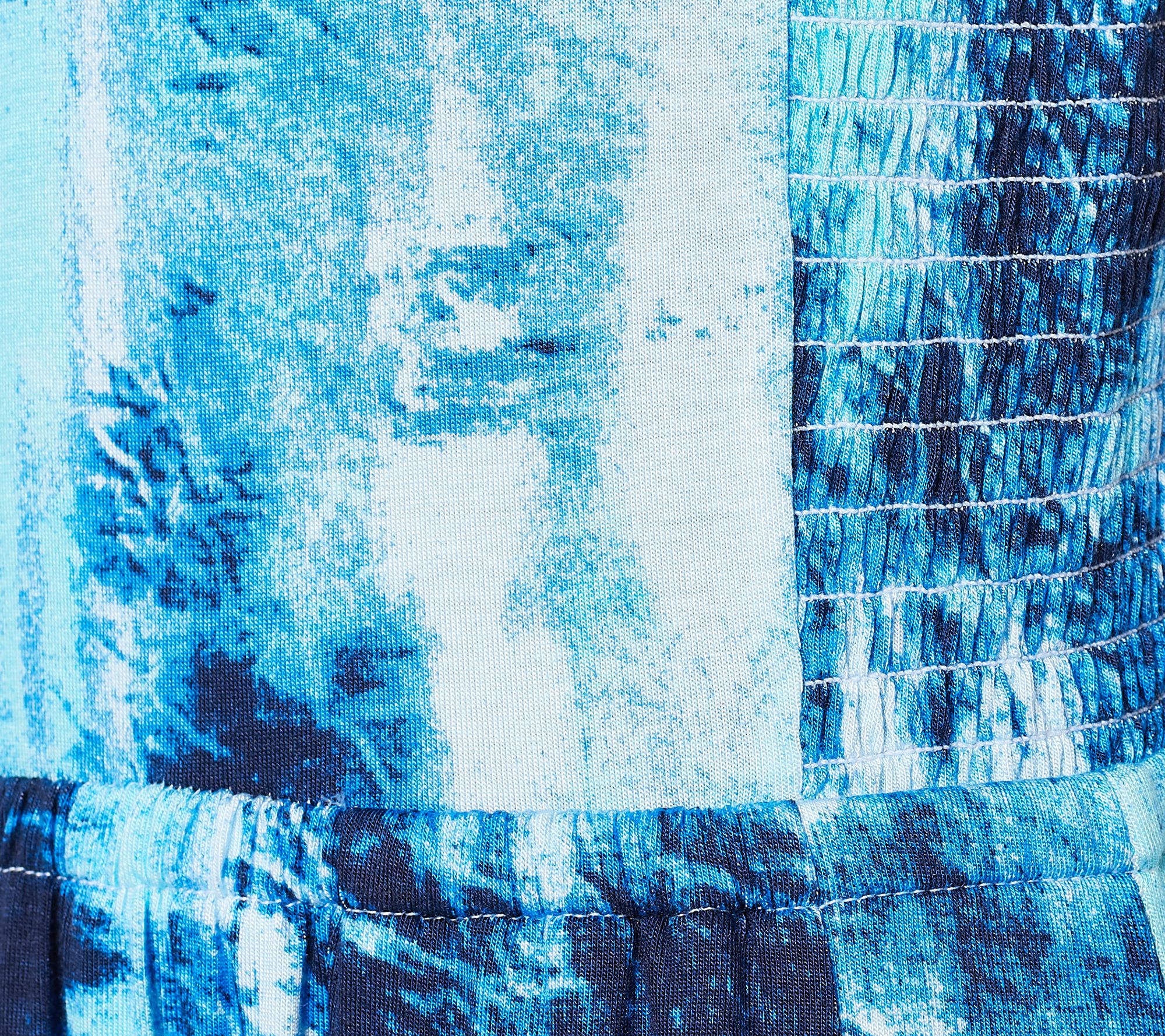 Features: smocked side panels, tunneled elastic waist, shirring detail, sleeveless, scoop neck, side-seam pockets, bottom hem flounce