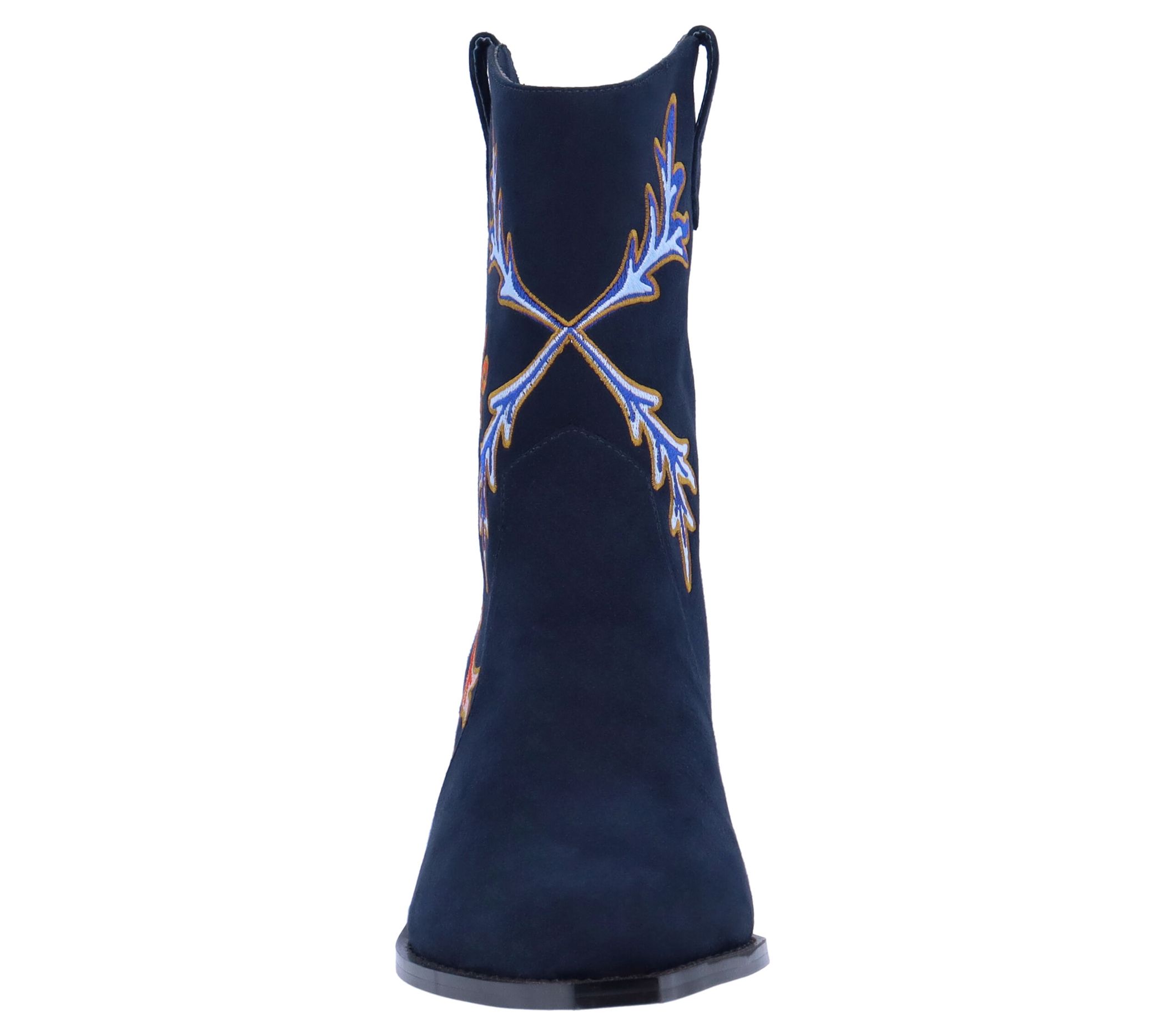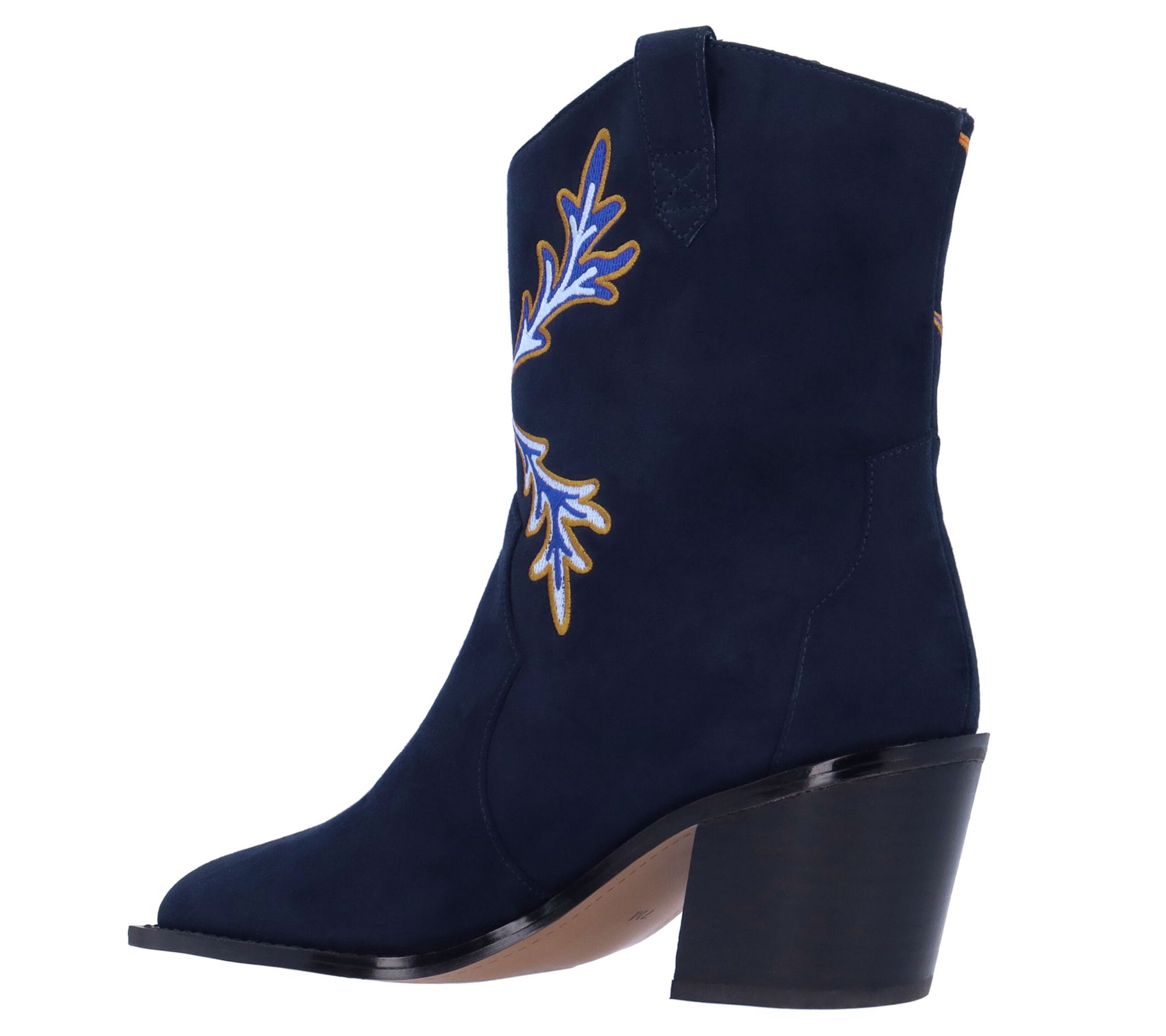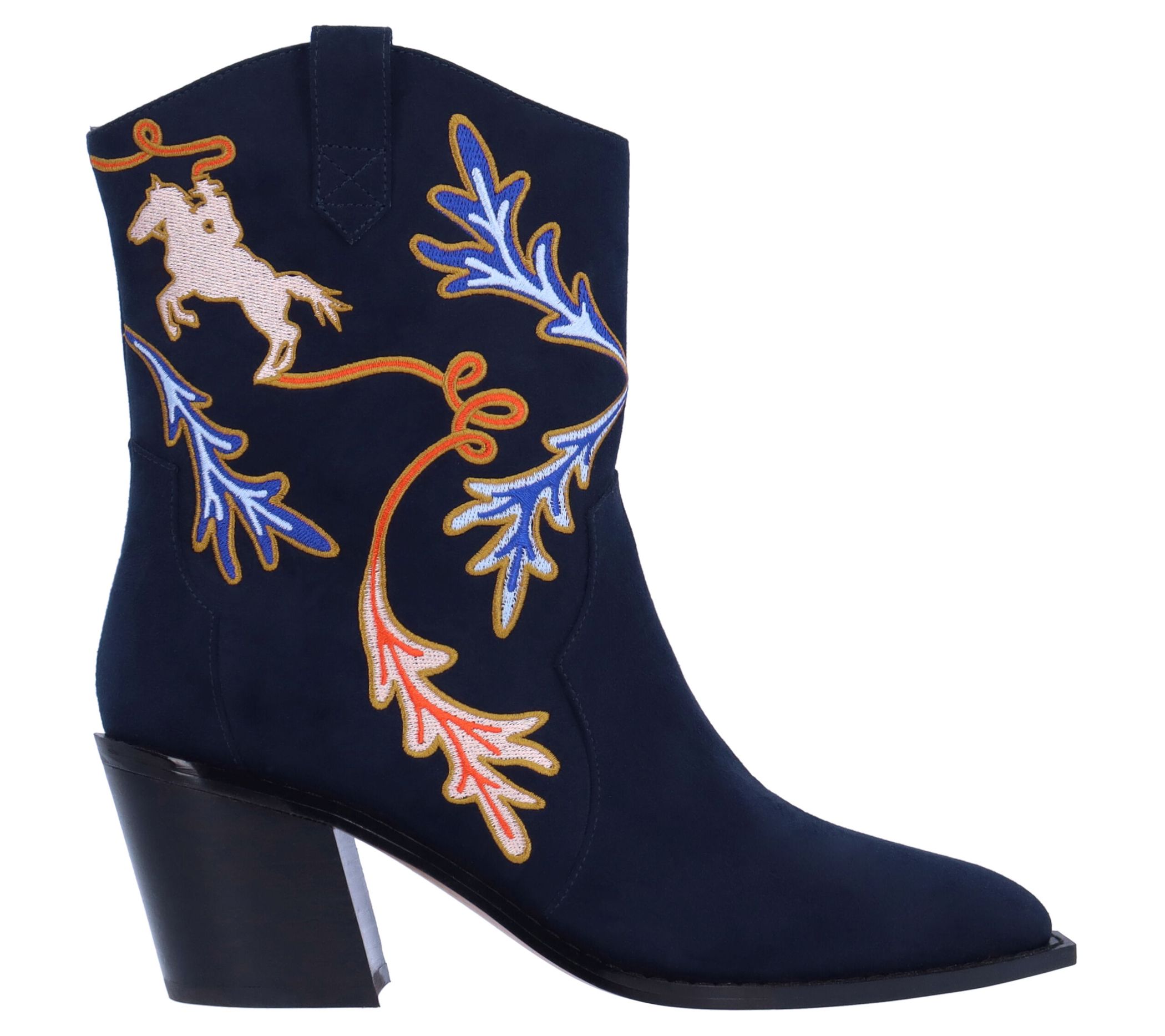 Step into Western style with the Skyla cowboy boot. Beautifully crafted, this boot features intricate navy and red embroidery that adds a touch of flair to any outfit. The memory foam and latex insole ensures all-day comfort, while the pull-on design makes it easy to slip on and off. From J. Renee'.