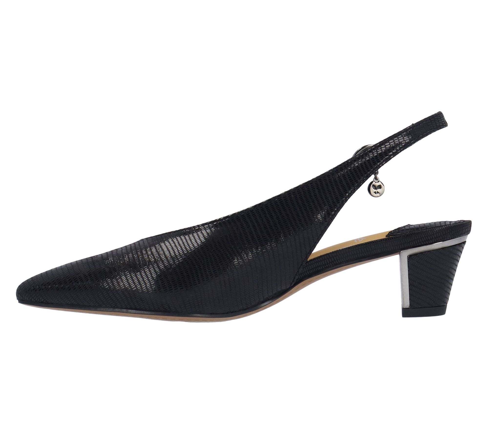 • Buckle closure; pointed toe; lizard-embossed reptile print patent upper