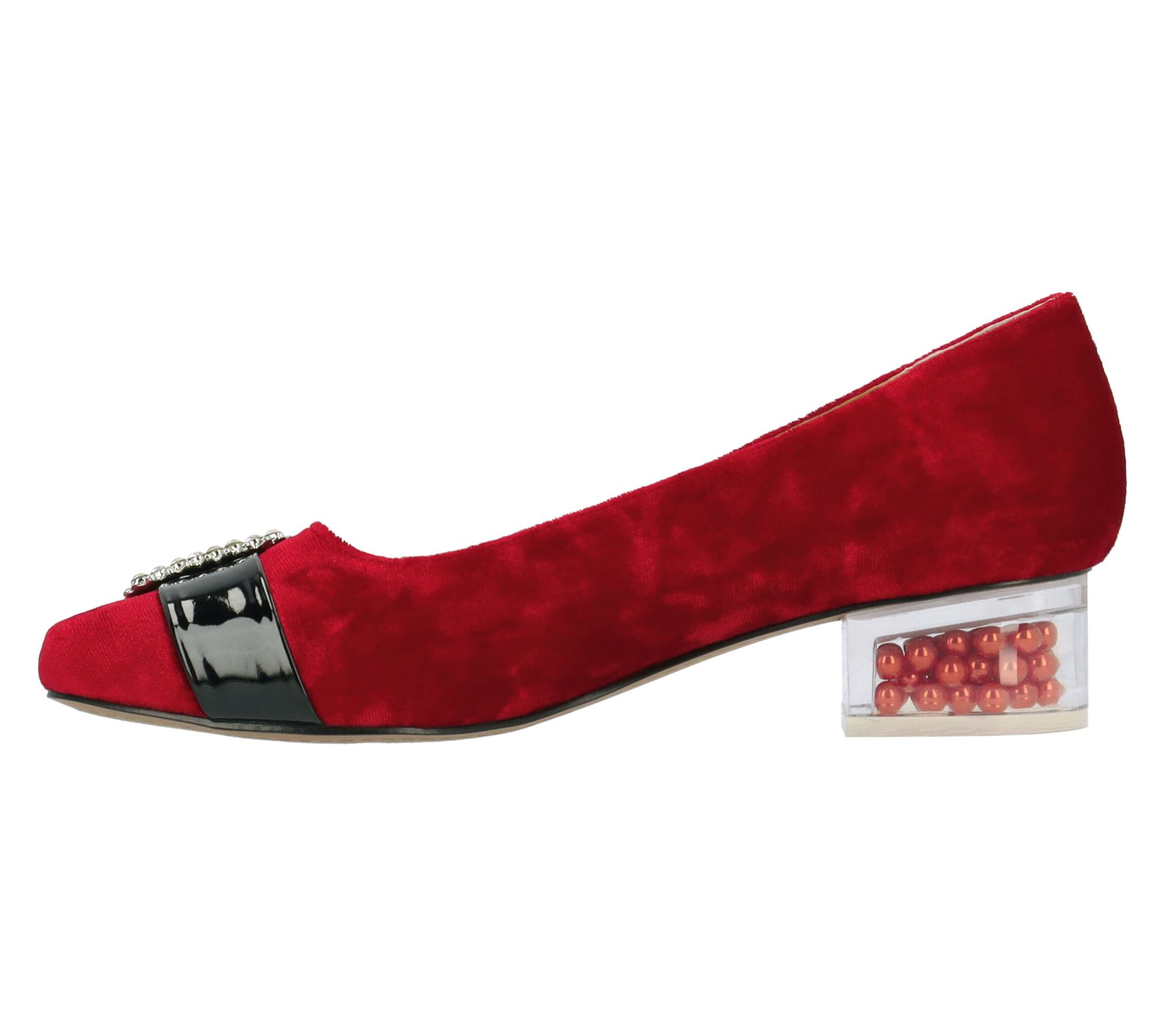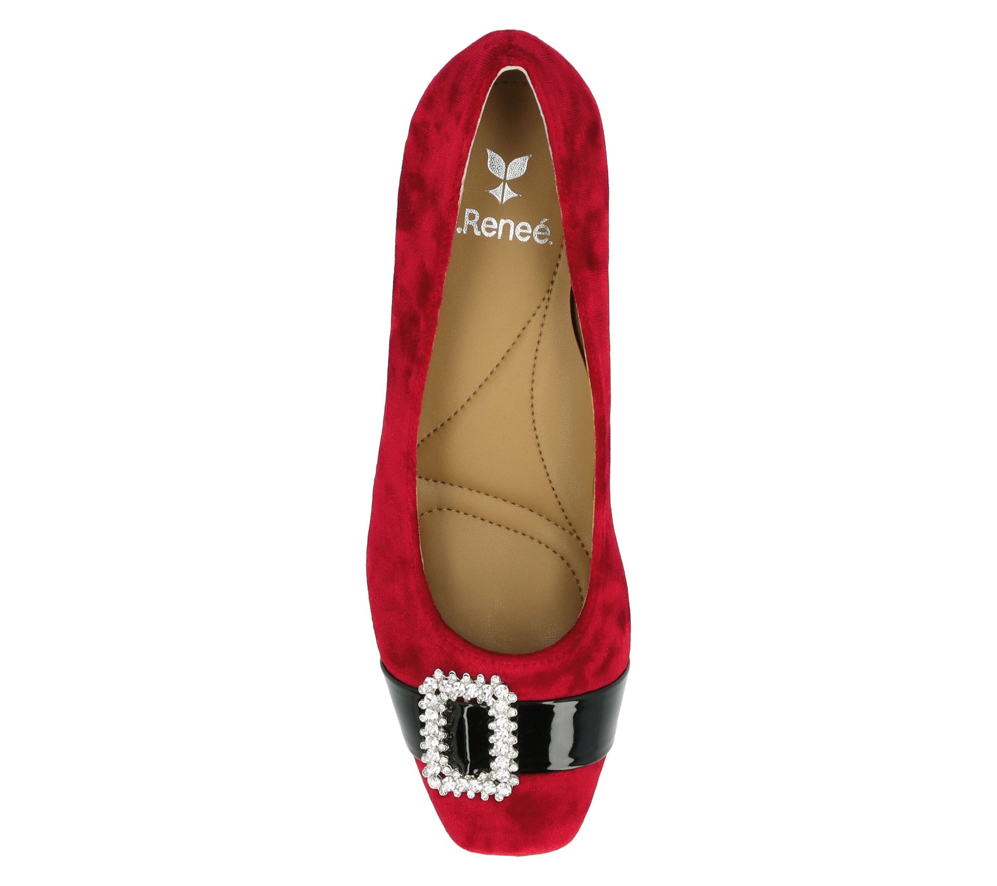 • Slip-on style; square toe; velvet fabric with synthetic patent detail