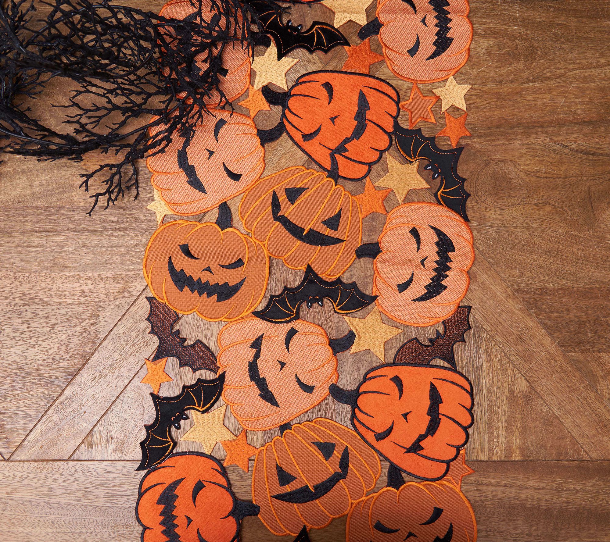 Transform your dining space into a festive haven this Halloween with this intricately designed table runner. Featuring a charming blend of embroidered jack-o'-lanterns, bats, and whimsical stars, it adds a sophisticated yet playful touch to your decor. Whether hosting a Halloween feast or enjoying a cozy supper, this polyester piece offers a little seasonal magic to any setting. Its refined design ensures it complements both casual and festive gatherings, delighting guests with its charm. From the Valerie Parr Hill Collection.