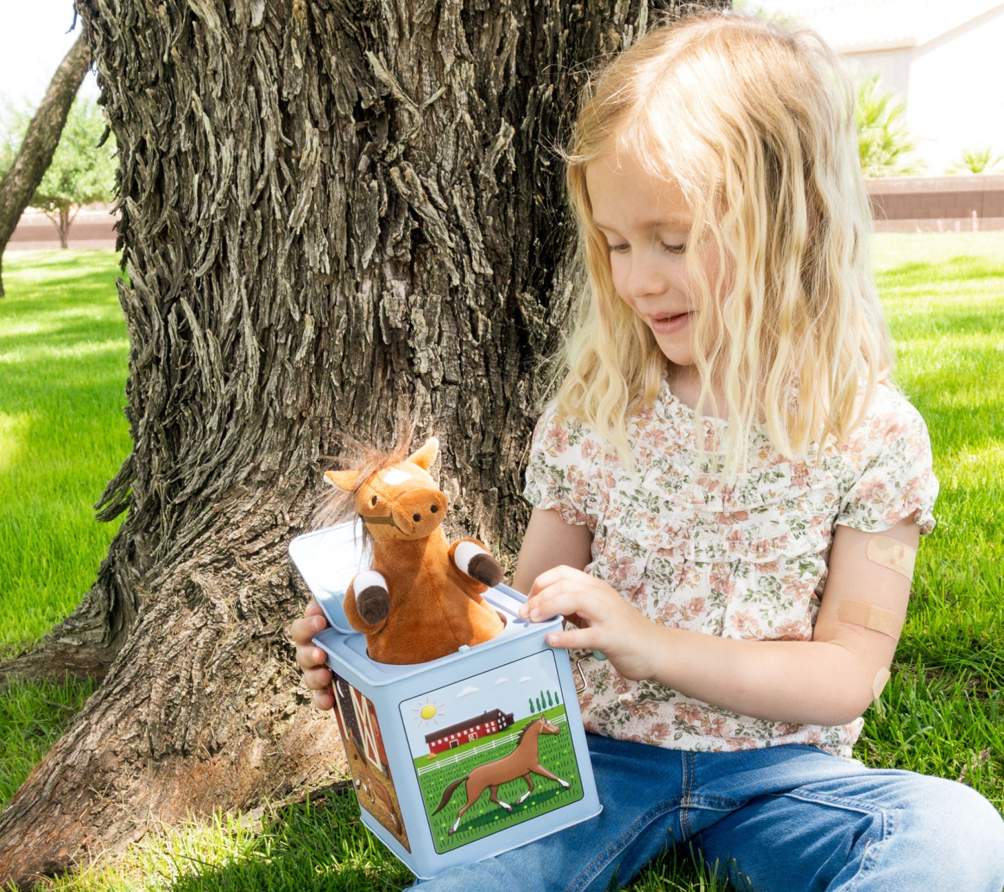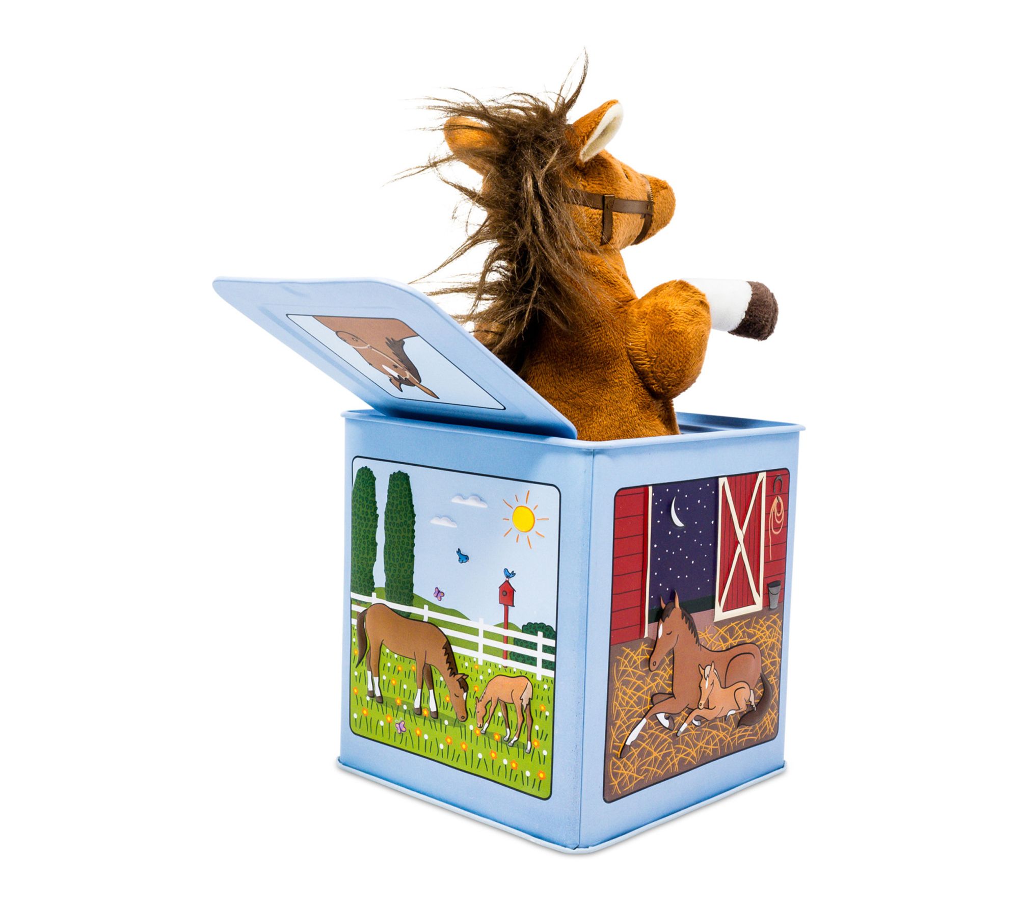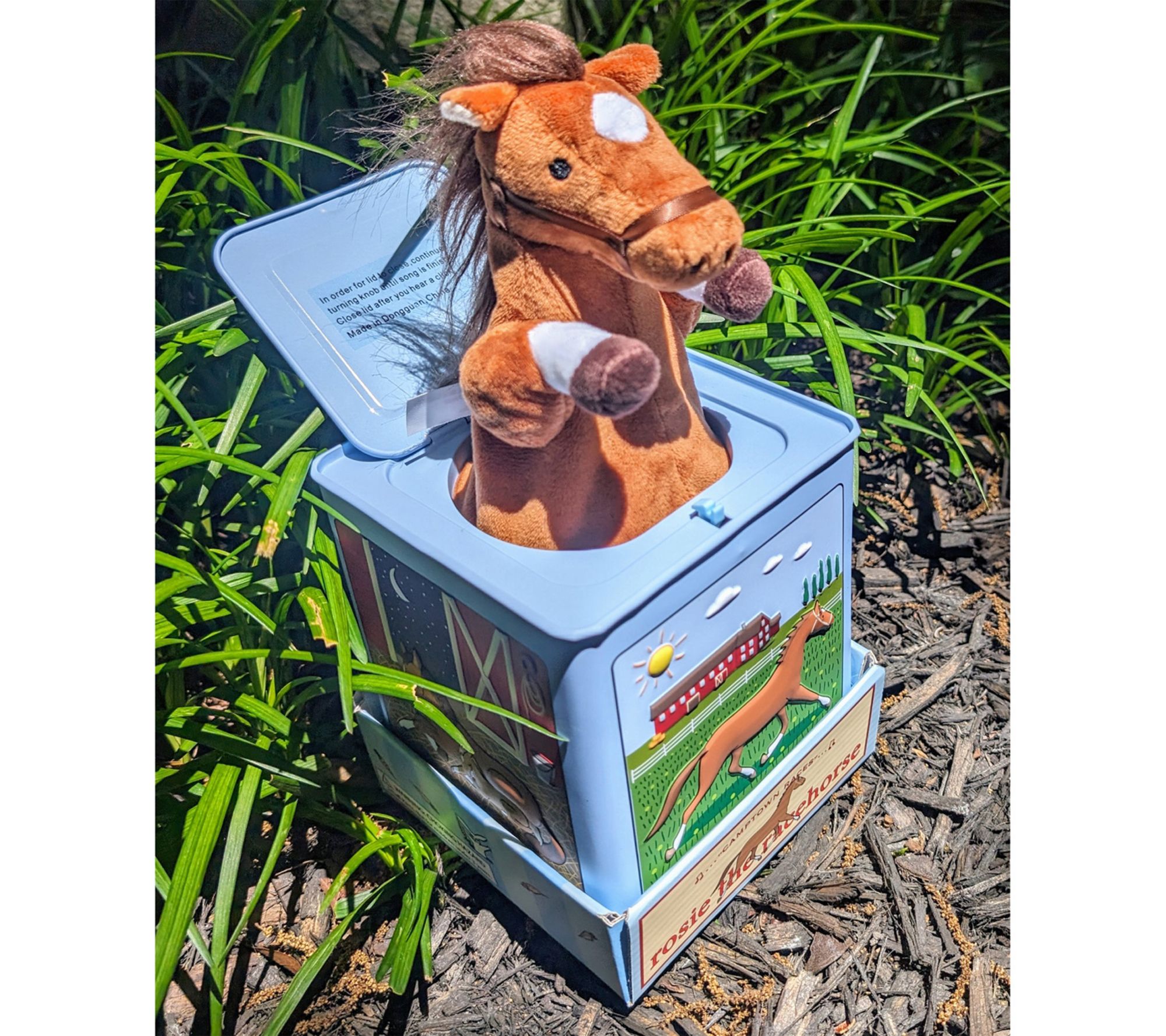 Bring a touch of nostalgia to playtime with this Rosie the Racehorse Jack-in-the-Box, featuring cheerful artwork and a soft horse plush that pops up to the tune of "Camptown Races." Delight a child with the timeless surprise of this musical toy, perfect for birthdays or everyday fun. From Jack Rabbit Creations.